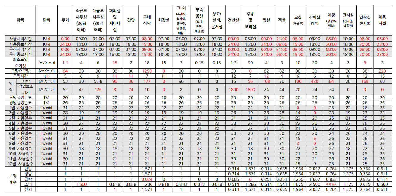 해당 건물의 용도에 따른 운전조건 (스케쥴)