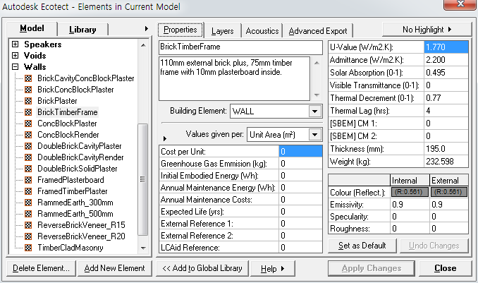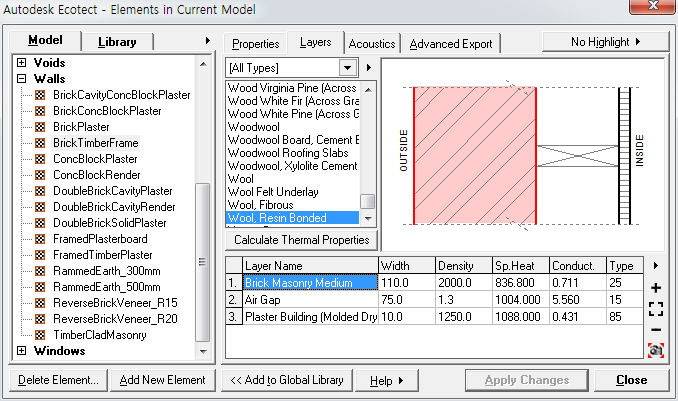 이 화면에서 중간의 Layers 를 누르면, 해당 벽체의 구성 상세가 보입니다. 즉, 외부~실내측까지의 자재 구성이 보이는데.. 여기서 내단열,외단열,중단열을 구성하시고 시뮬레이션 하시면 됩니다. 각 각 하나의 벽체만 만들면.. 다른 벽체는 Properties 에서 그냥 클릭만 하면 적용됩니다. 감사합니다.