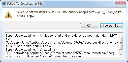 협회 및 학회에서 제공되는 기상데이터를 에너지플러스 기상데이터 변환 후 오픈스튜디오에서 불러드리고 싶은데 오류가 발생합니다.