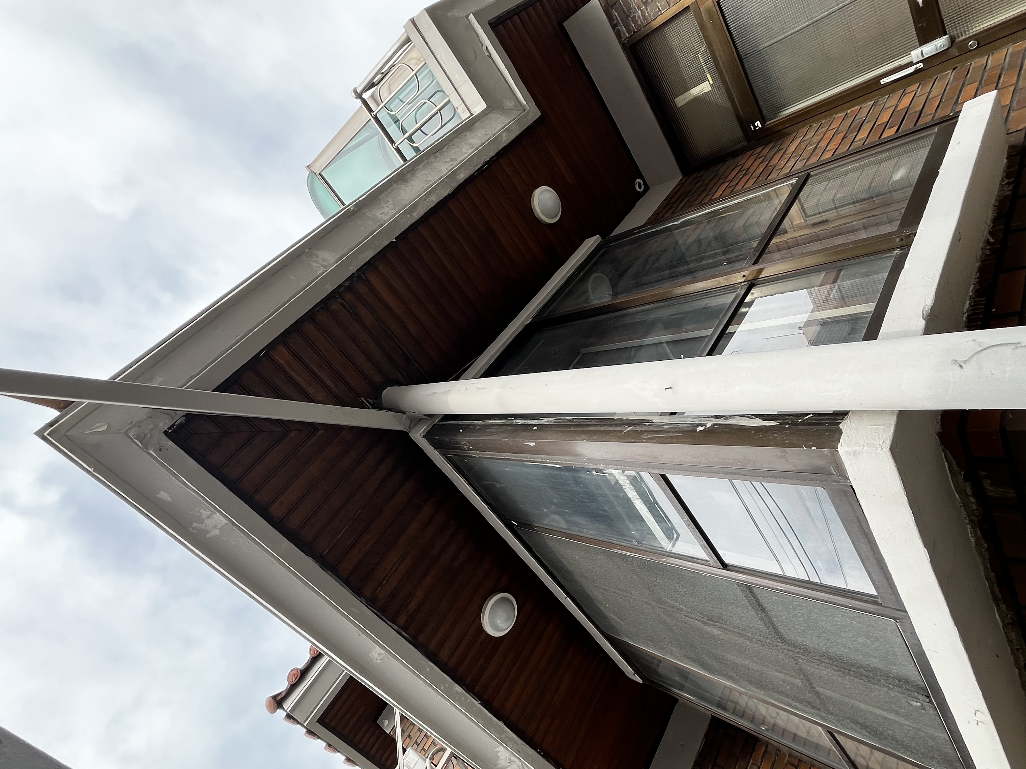 최근 매매 후 입주하여 발코니를 확인한 결과, 발코니 슬래브 끝단이 1~2cm 쳐짐이 느껴지며, 발코니 하부에 이미 철제 보강 기둥이 설치되어 있음을 발견했습니다. 매매 당시 이 사실은 고지받지 못했습니다. 또한, 2층 발코니에는 렉산 지붕과 샤시가 설치되어 있습니다 (사진 참조).