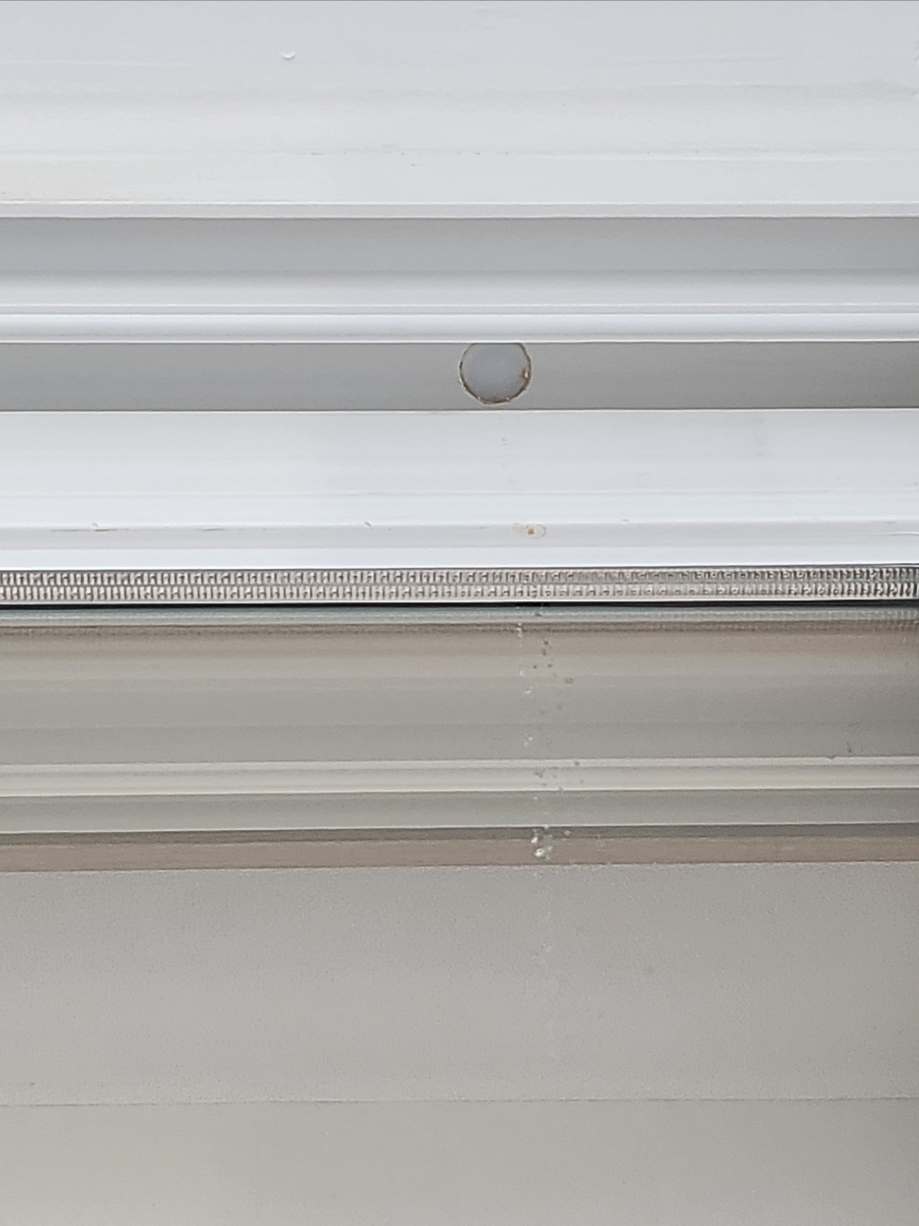창문 가운데 프레임부분과 양쪽 위의 동그란 마개부분에서 물이 흘러내린 자국이 확인되었습니다.
