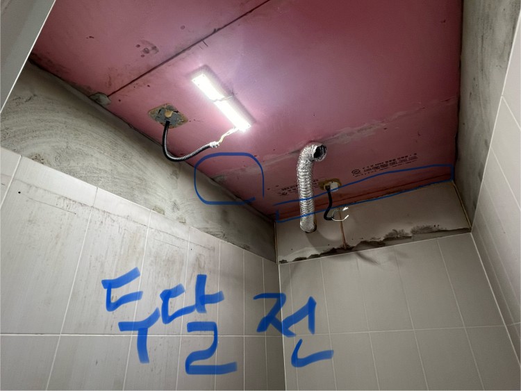 저도 처음엔 배관에 떨어지는 소리라고만 생각했는데 둘째날 천장 점검부를 열어 체크해보니 핑크단열재 틈으로 물이 떨어지는거까진 아니고 물기가 보이고, 옆면 콘크리트가 젖은 걸 확인했어요.