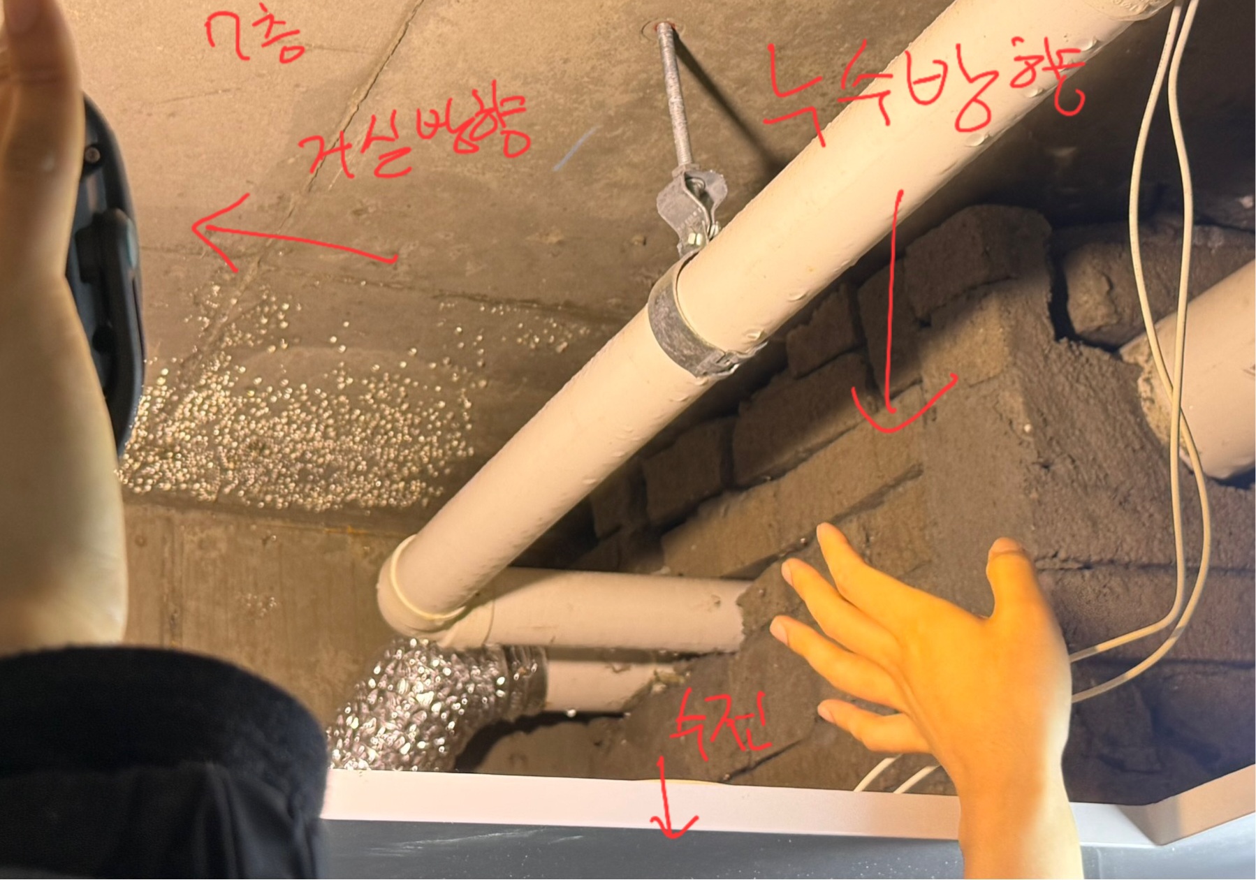 저희집화장실 천정누수가 2-3층 아래 거실에 누수를 발생시켰다네요