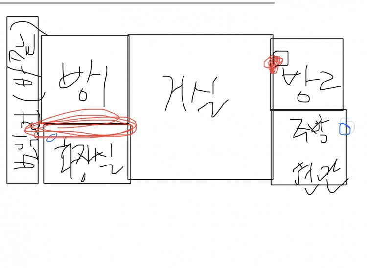 방1, 방2 빨간색 칠한 곳이 똥냄새 나는 부분입니다.