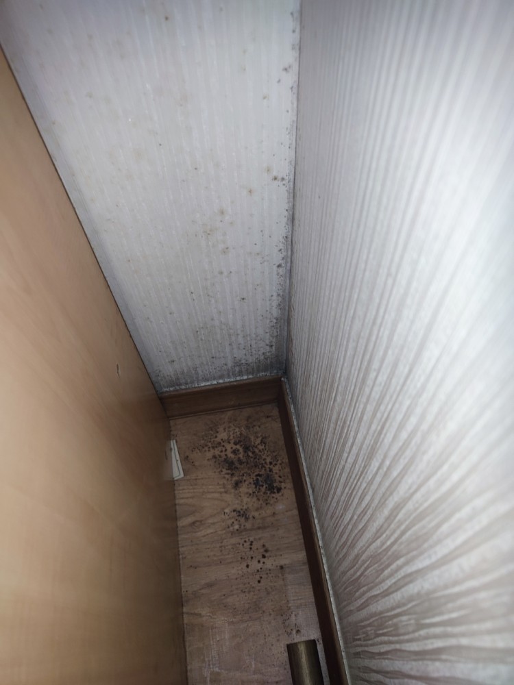지금은 안방 창문 왼쪽 바닥에서 부터 곰팡이가 피어서 벽 모서리 위쪽으로 번졌어요.