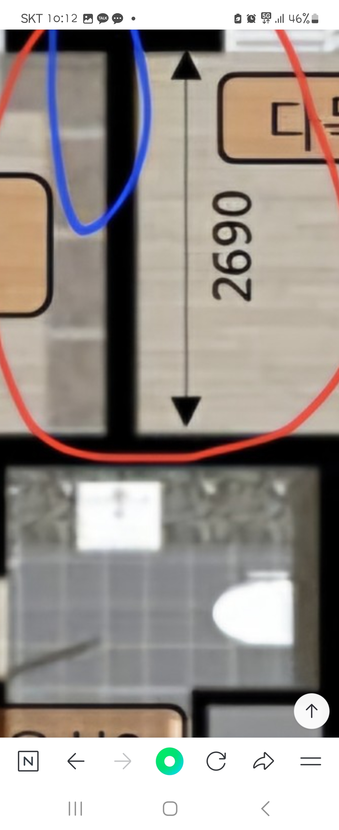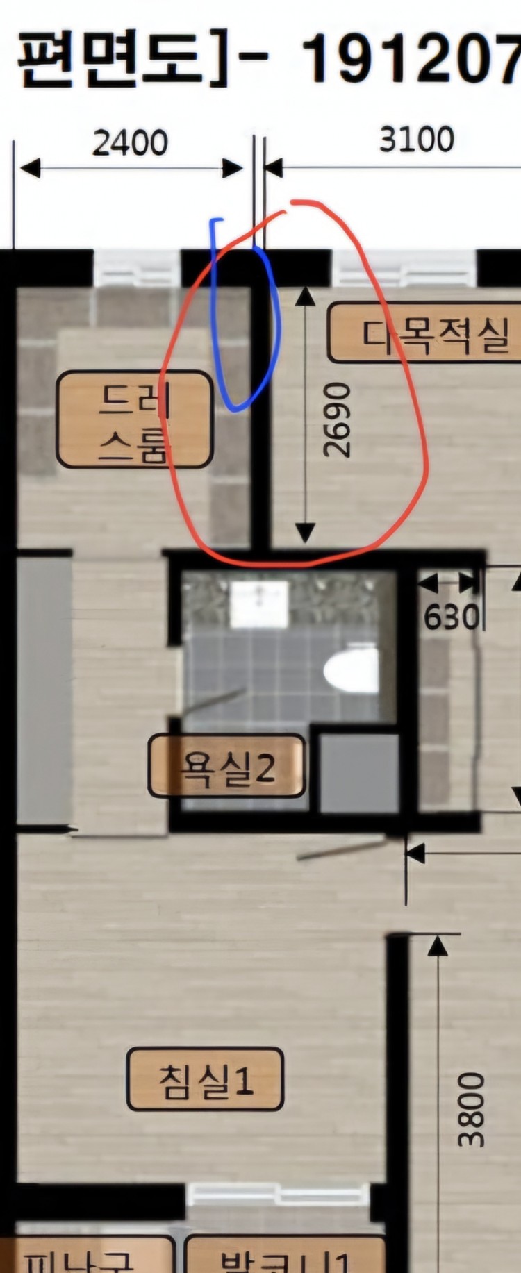 빨간원 벽체라인 따라서는 욕실2  세면대가 있습니다