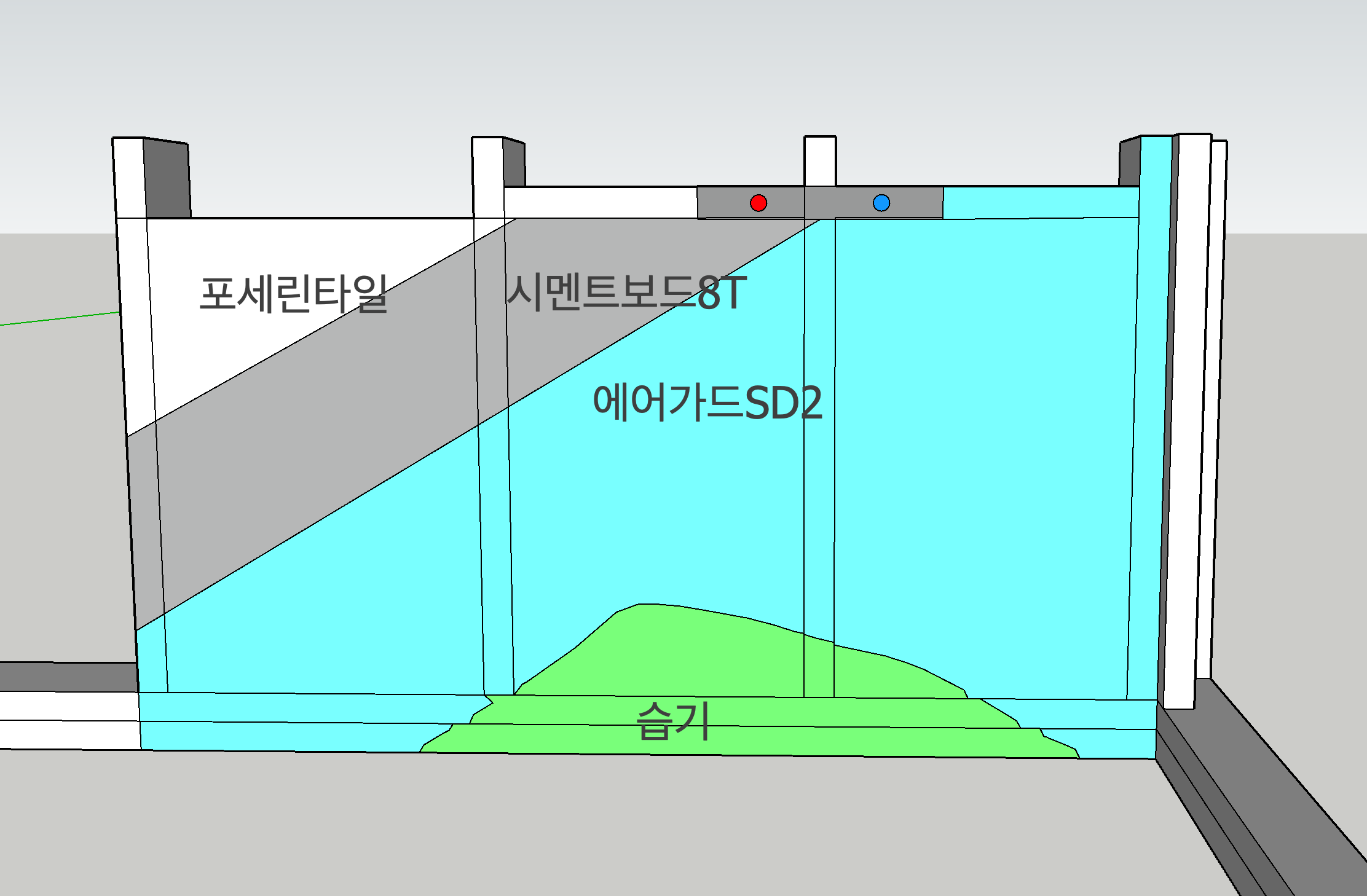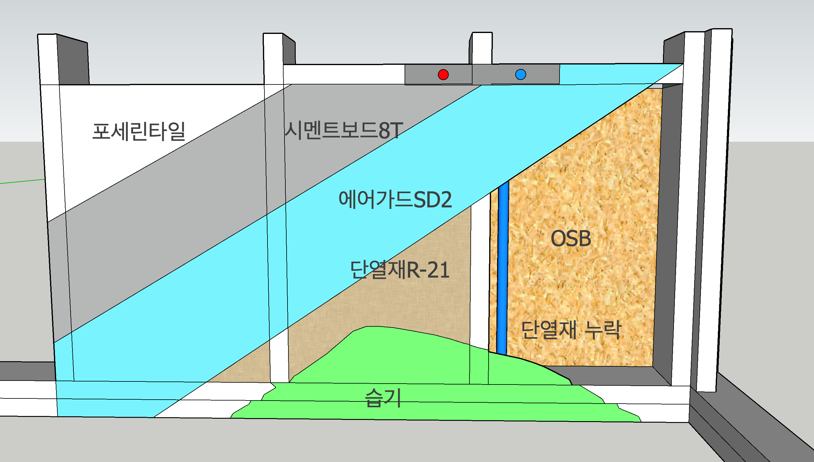 겨울철 단열재가 없는 상태에서 외부 합판과 실내측의 가변형방습지 그리고 시멘트보드, 타일만이라면 결로가 생기는 조건에 만족을 한다고 볼 수 있습니다.