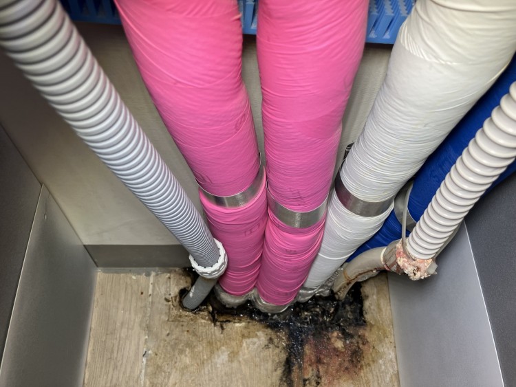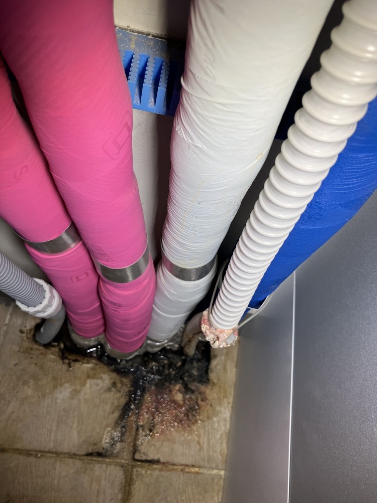 바닥의 색으로 보아서.. 보일러 유출수가 잘 내려가지 못하는 상황으로 보입니다.