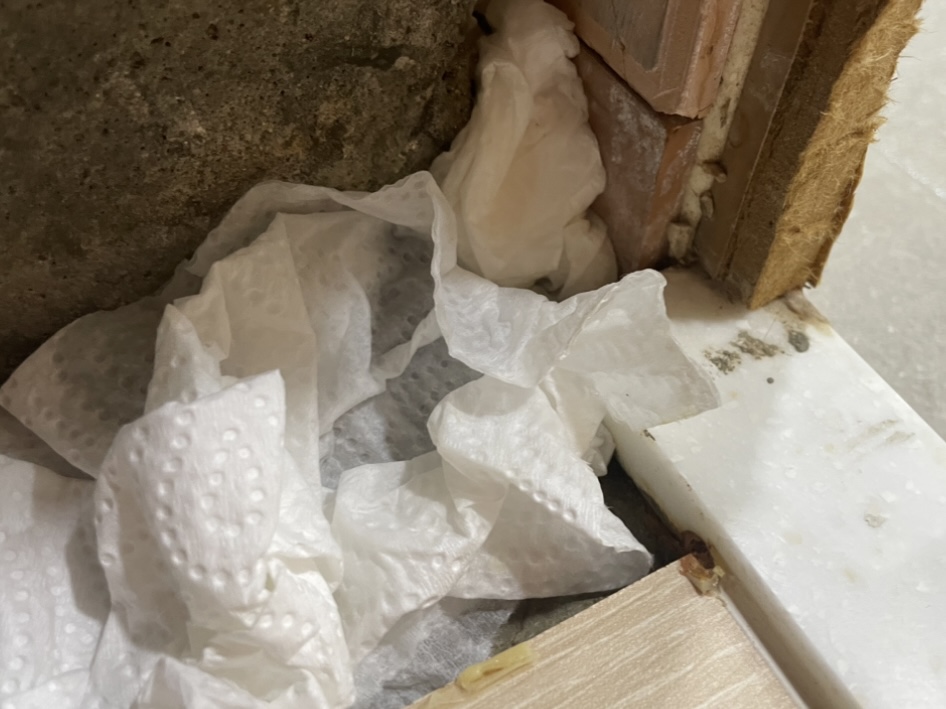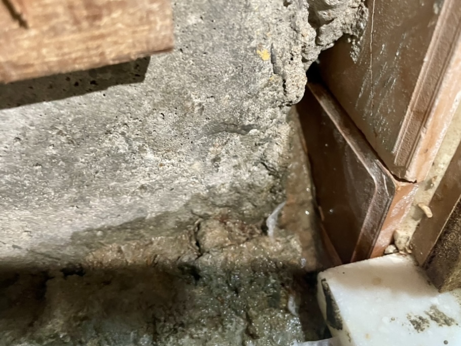 2. 기존 타일과 덧방한 타일 사이의 틈을 메지나 시멘트 혹은 실리콘 등으로  메꿔 혹시 누수가 되더라도 덧방한 타일 바깥 쪽으로 물이 흐를 수 있도록 마감을 하여야 하는데 덧방 시공한 업자분이 마감시공을 제대로 하지 않아 누수가 기존 타일과 덧방 타일 사이로 흘러 들어가 욕실 벽과 바닥 사이 어딘가를 돌아다니다가 욕실 문틀이 목재라서 물을 흡수하니 문틀 사이에서 고이고 있었습니다.