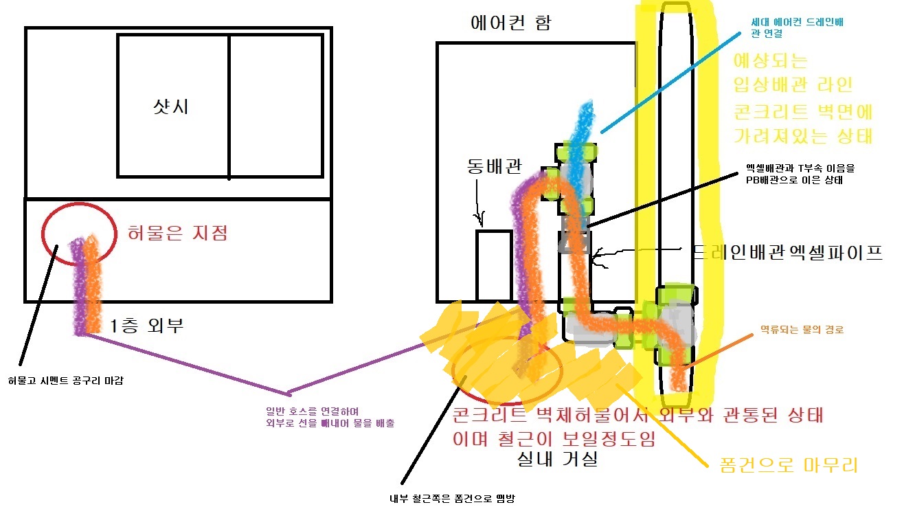 파란색 마킹 부분은 세대내 에어컨 드레인배관(주름관)을 연결한 상태이구요.