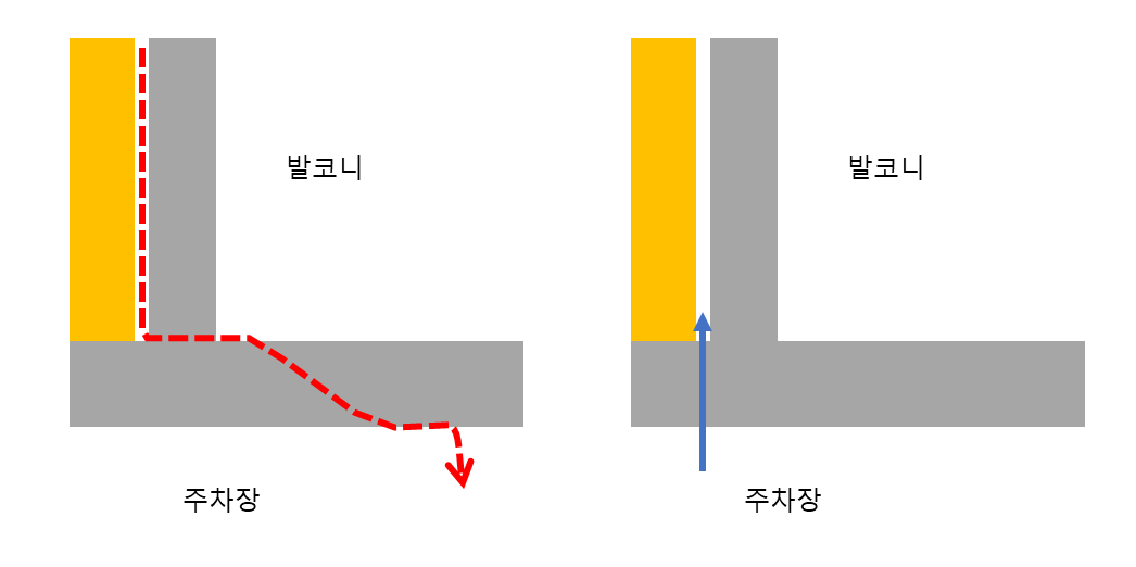 사진에 보이는 단열재 뒤쪽으로 빗물이 넘어 올 수 있습니다.