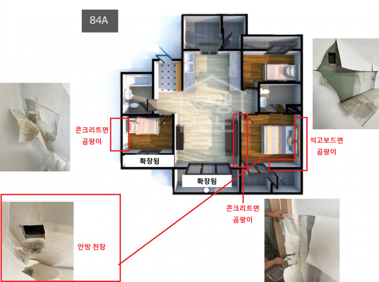1. 6년차 아파트 이사 후 도배 1개월 경과 후, 안방(천장, 콘크리트, 석고보드면)과 작은방(콘크리트면) 곰팡이 발생 * 외관상 이상이 없어 보이는 곳은 벽지를 뜯지 않아 추가 곰팡이가 있을 가능성이 있습니다.