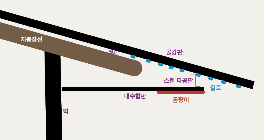 답변 감사드립니다! 그럼 응축수가 타공판을 타고 내려와서 합판 끝을 타고 아래쪽으로 흐른다는 말씀이신거죠?