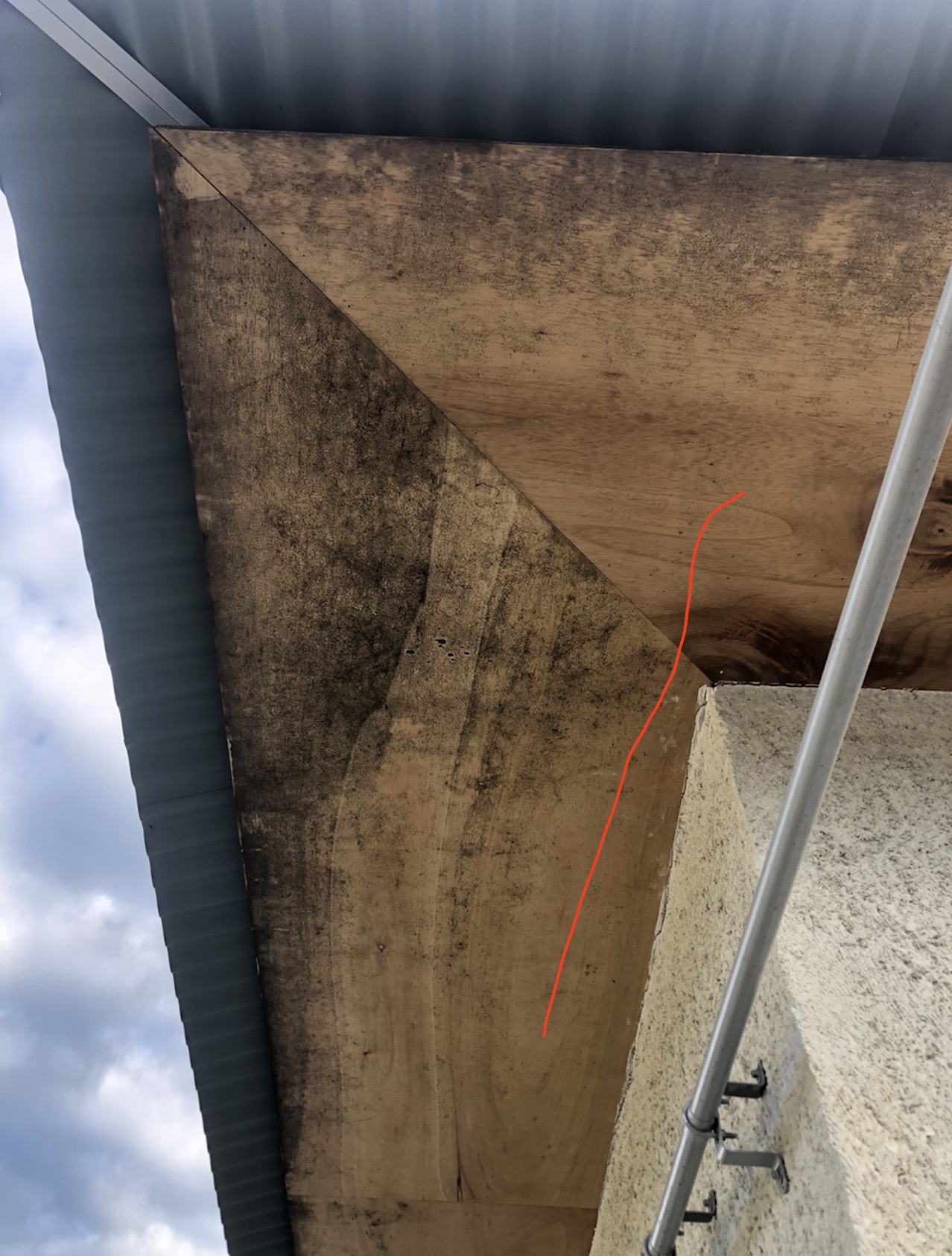 모임 지붕 처마 아래 합판 마감에 곰팡이 발생 문제