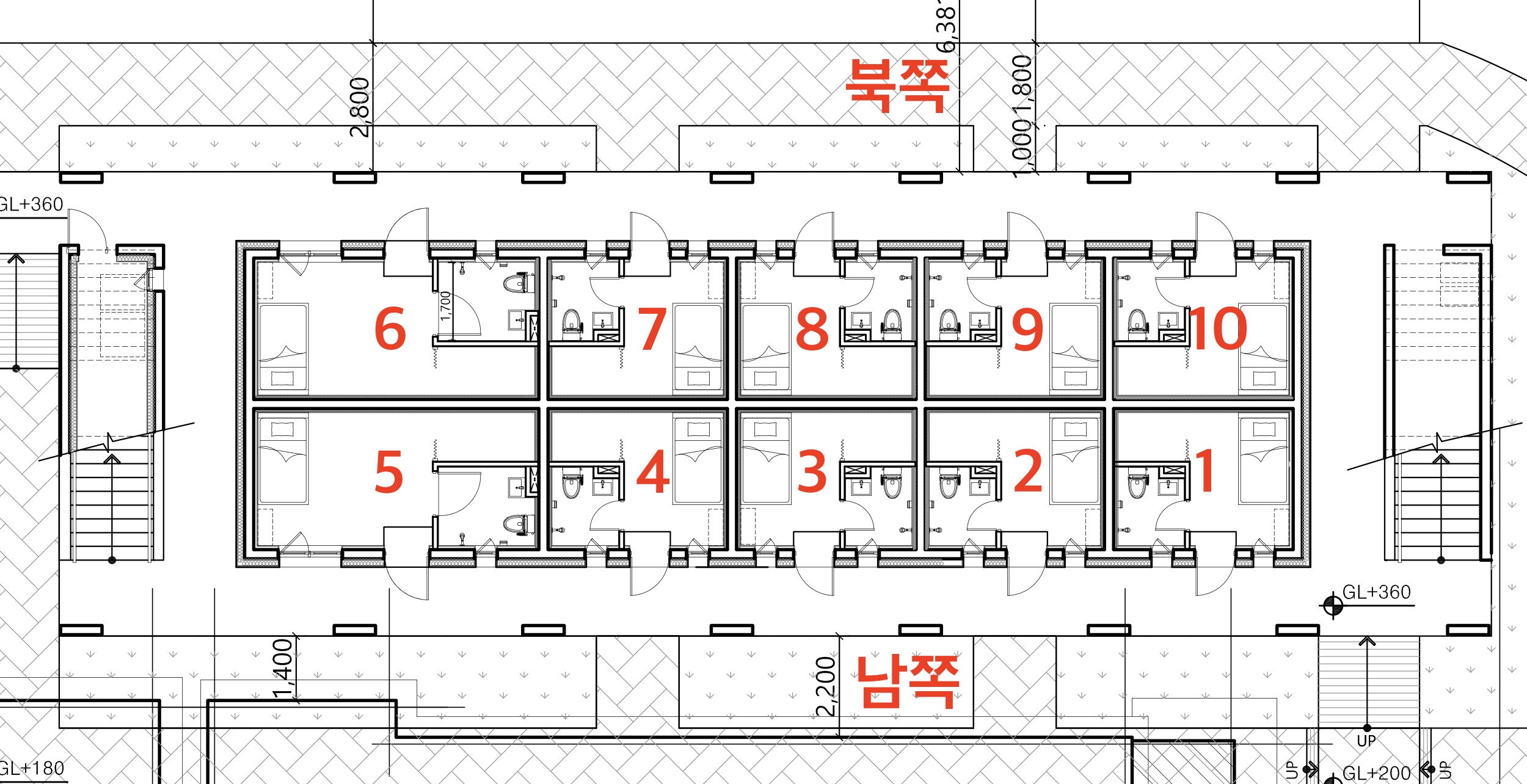 200평 규모이고 2층에 총 20개의 방이 있습니다.(1층10개, 2층 10개)  각 방은 3평 정도이고 샤워가 가능한 화장실이 방마다 있습니다. 패시브 수준까지는 아니지만 외단열에 역전 지붕에 3중 유리 시스템 알루미늄 창호라서 단열과 기밀이 좋은 편입니다. 전열교환기는 경동나비엔 제품을 설치했습니다.