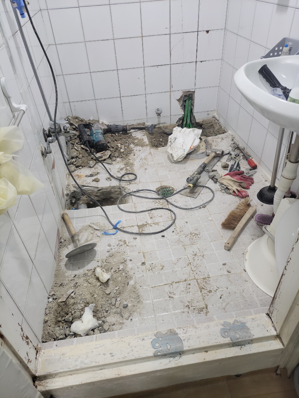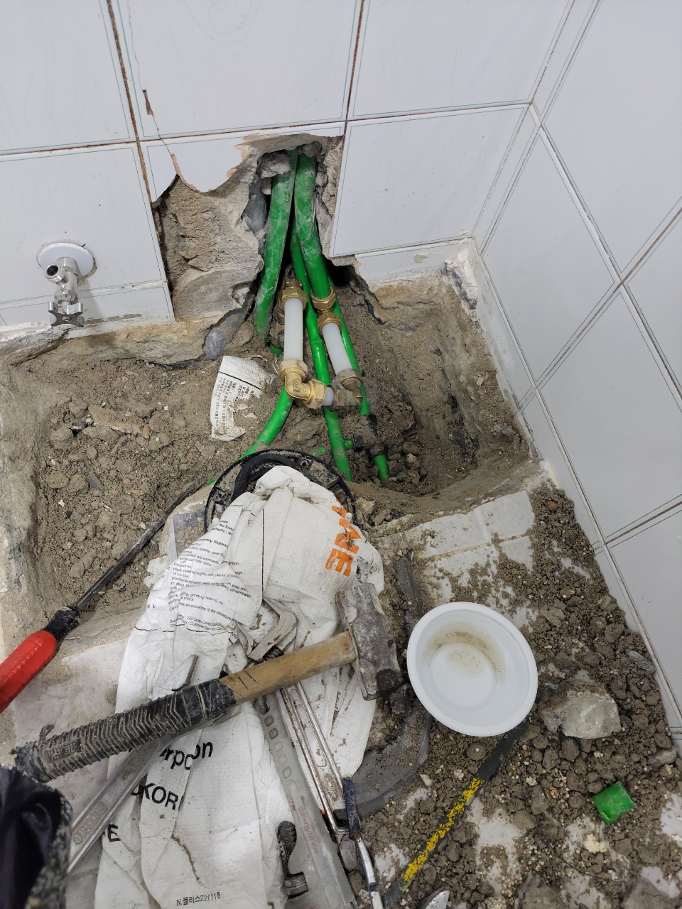 첨부 사진은 저희 욕실 공사중 사진입니다 업자 얘기는 연두색 중간이 샌다고 말했습니다