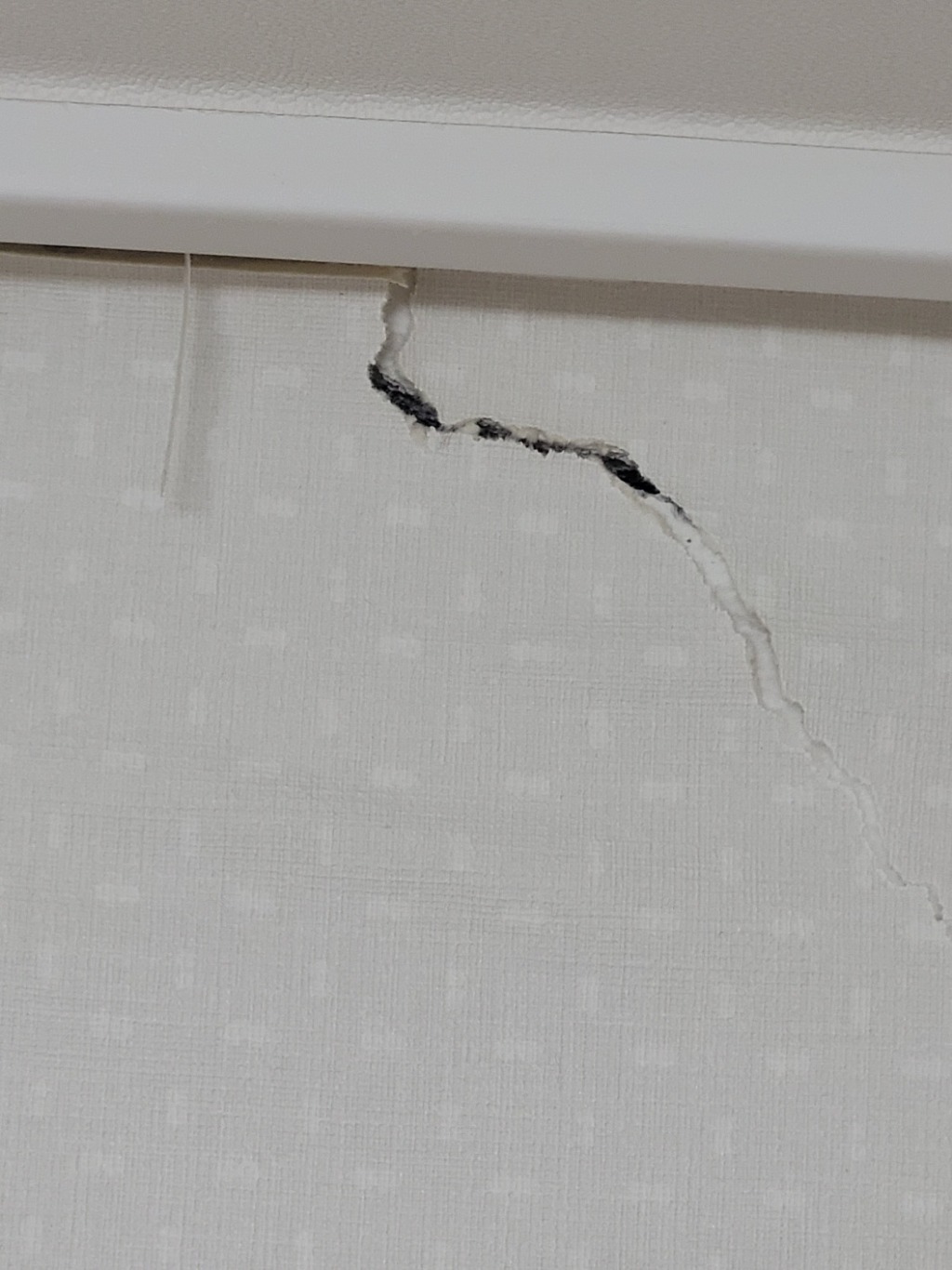 두가지로 나누어 말씀을 드려야 하는데요. 1. 마감재의 사진이라서.. 이 마감재를 절개해서 그 안에 있는 구조체 자체의 균열 폭을 알아야 합니다. 2. 콘크리트 벽인지 확인이 되셔야 하는데요. 콘크리트 벽이라면 빠른 시간 내에 보수를.. 조적벽이라면 너무 늦지만 않게 보수가 필요합니다.