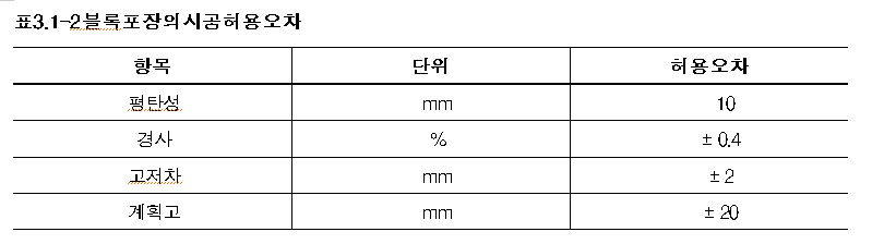 (1) 허용오차 범위를 벗어난 부분은 시방 요구조건에 맞도록 수급인 부담으로 수정되어야 한다. 수정을 위한 블록 제거 시 블록이 파손되지 않도록 주의하여야 하며, 파손된 블록은 사용할 수 없다.