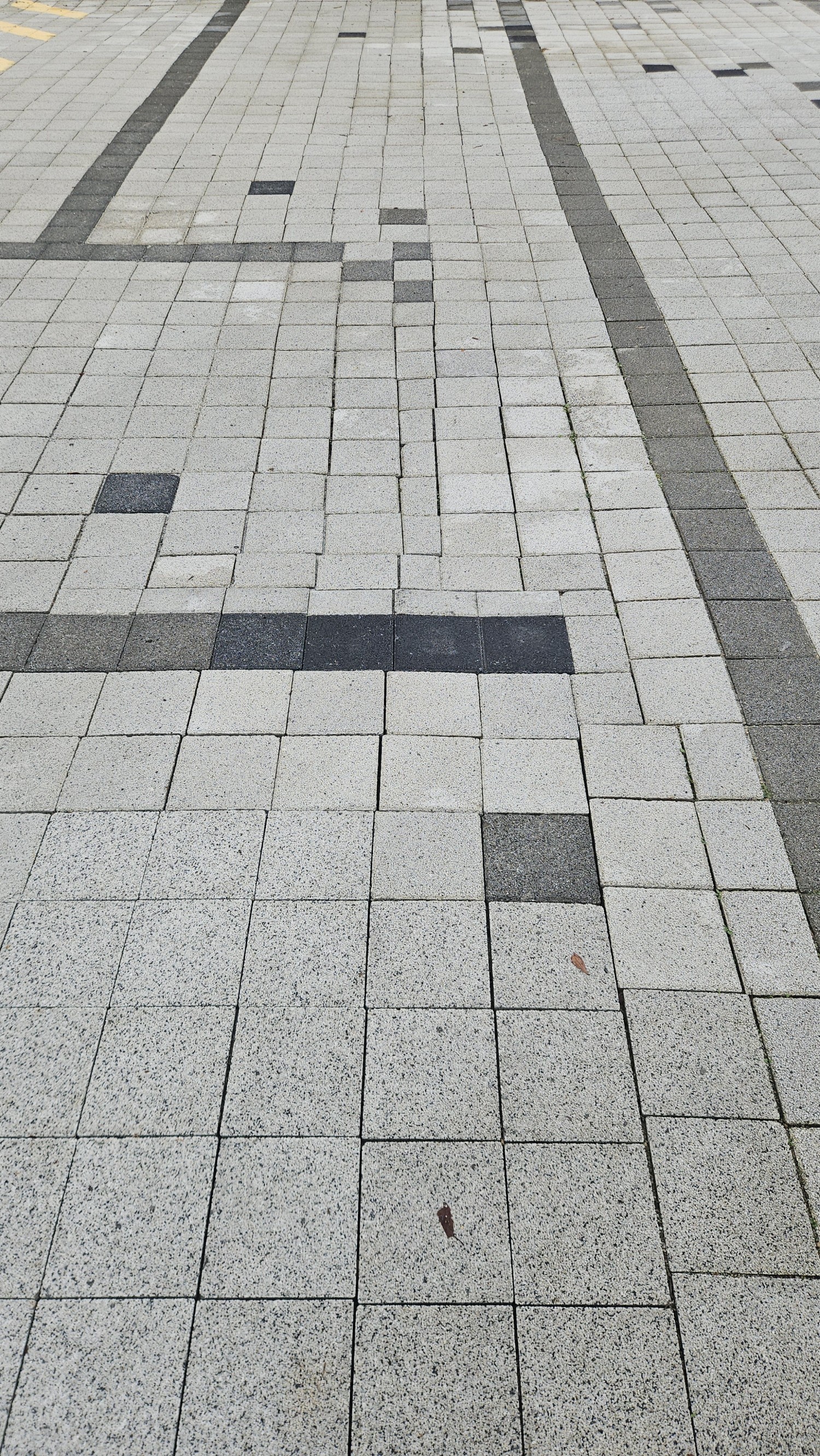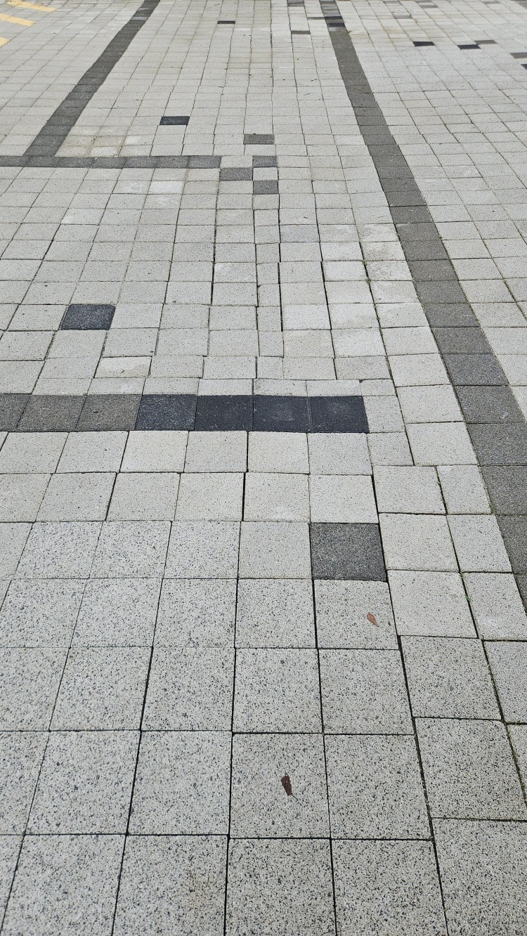 바닥이 평평하지 않은 상태에서 재포장하려니 간격도 안 맞아 블록을 자르며 공백을 메운 티가 나네요.