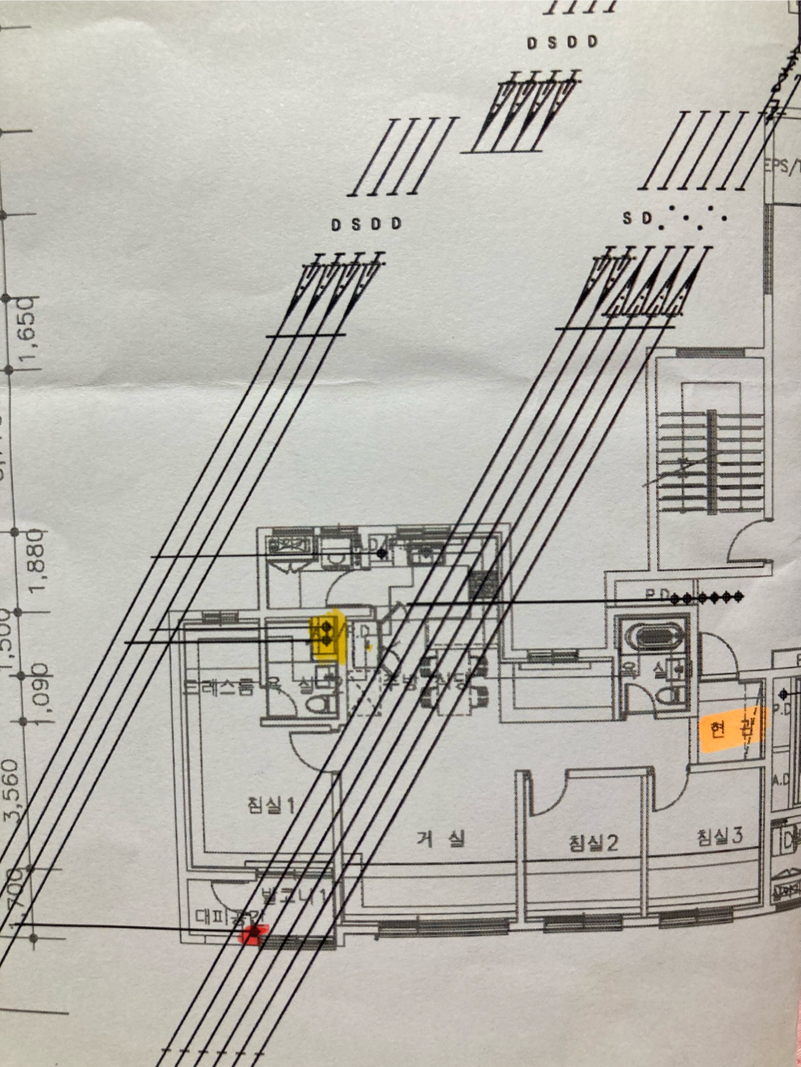 관리사무소에서 받은 평면도 중 저희집 부분만 찍은 사진입니다. 왼쪽 상단에 드레스룸 옆에 붙어 있는 욕실 천장 쪽에서 새는 중입니다.