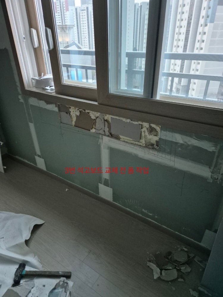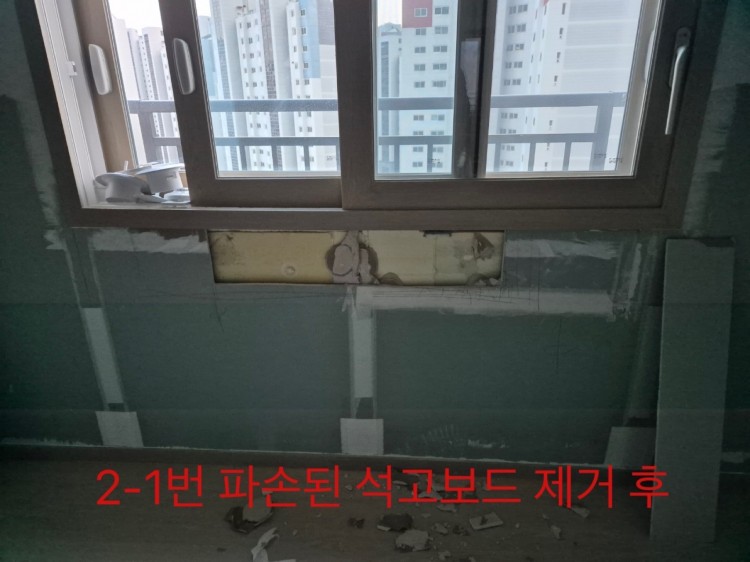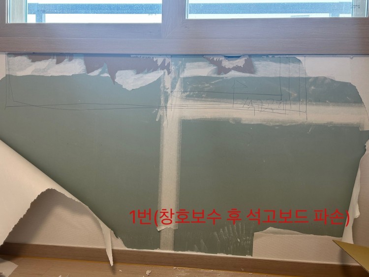 1번 사진은 올해 3월 입주 전에 창호쳐짐 하자가 있어 하자보수를 하다 석고보드가 파손된 사진입니다.