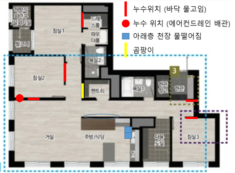 아래층 천장 누수 및 누수위치와 반대 방향에 있는 침실3 및 현관 옆까지 곰팡이 발견되었습니다.