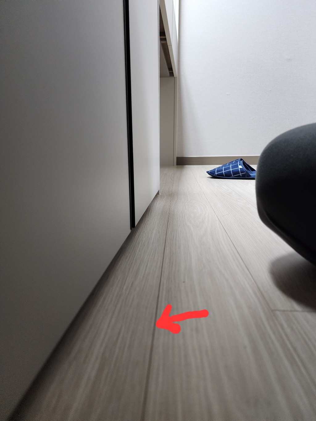 끝으로 사진도 첨부합니다. 화살표가 가리키는 바닥의 금을 기준으로 오른쪽 끝이 금을 넘어가 있는 것을 확인하실 수 있을 겁니다. 반대로 왼쪽은 금 안쪽으로 한참을 들어가 있습니다. 그 편차가 대략 5.6cm 정도 입니다.