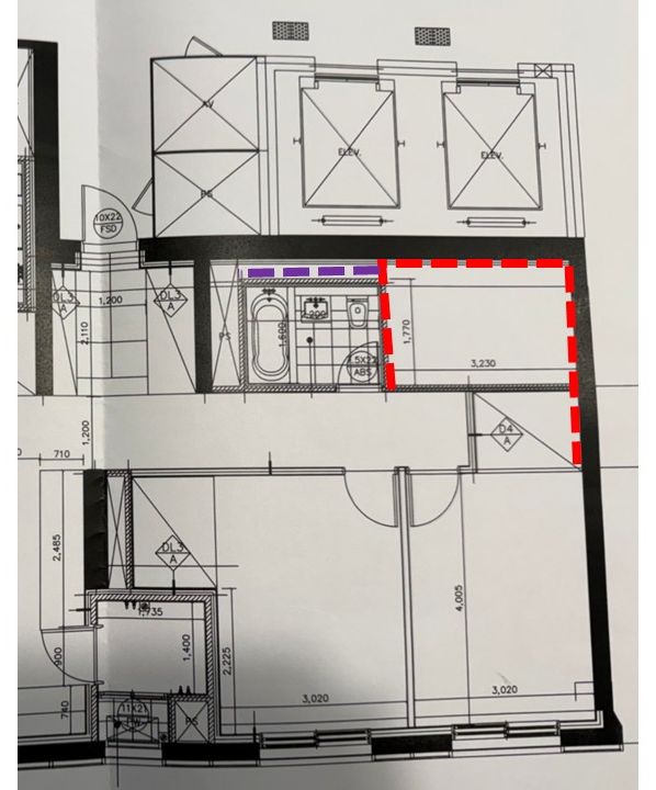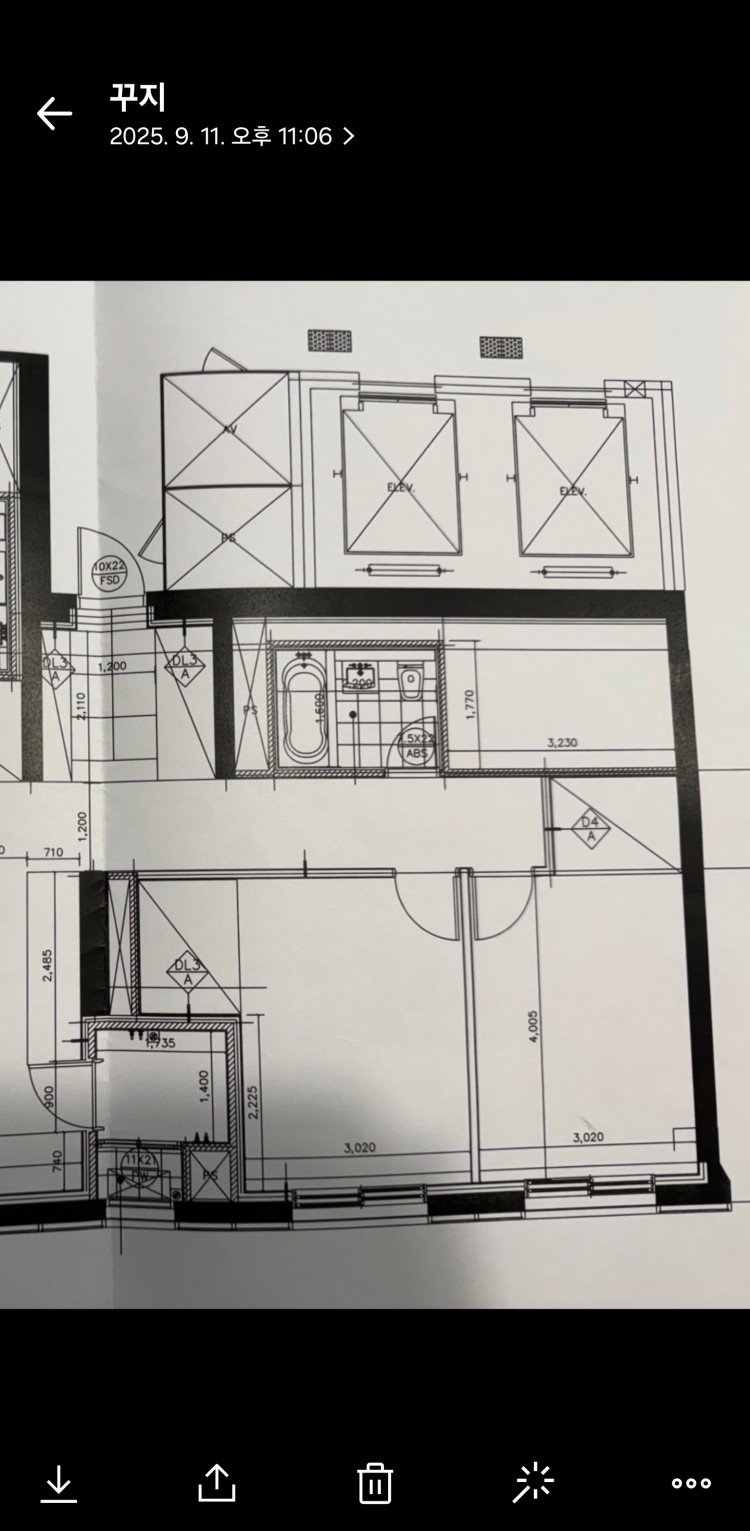 이 아파트는 아래 표시된 공간을 엘리베이터 소음을 고려한 완충공간으로 비워둔 것으로 보입니다. 다만 그 목적을 이루지는 못한 결과인데요.