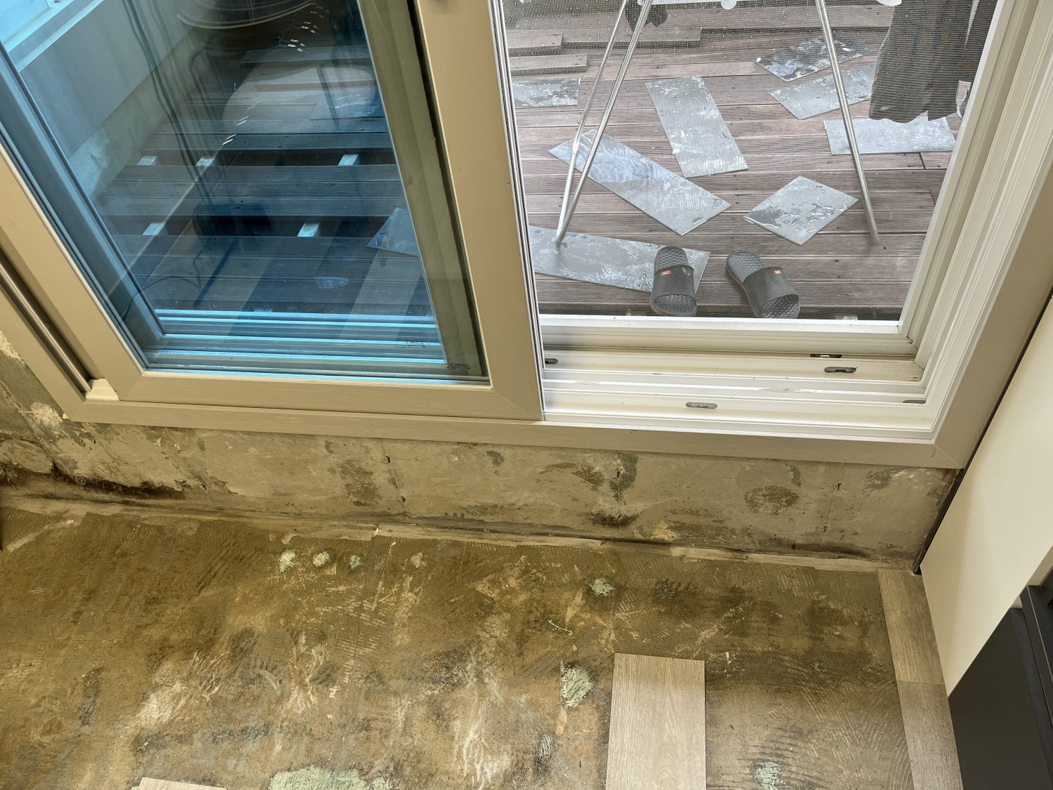 알고보니 2년전 이미 누수문제가 발생하여 테라스 부분에 전면 방수페인트 작업을 했다는 사실을 늦게 전달받았고, 해당 업체를 다시 불러 바닥과 벽지, 데크를 일부 뜯어내고 물기를 말리는 중 이었습니다. 해당 업체는 누수 공사는 이미 완벽히 했으니 누수는 아니고 벽 결로현상인것 같다고 주장했죠.