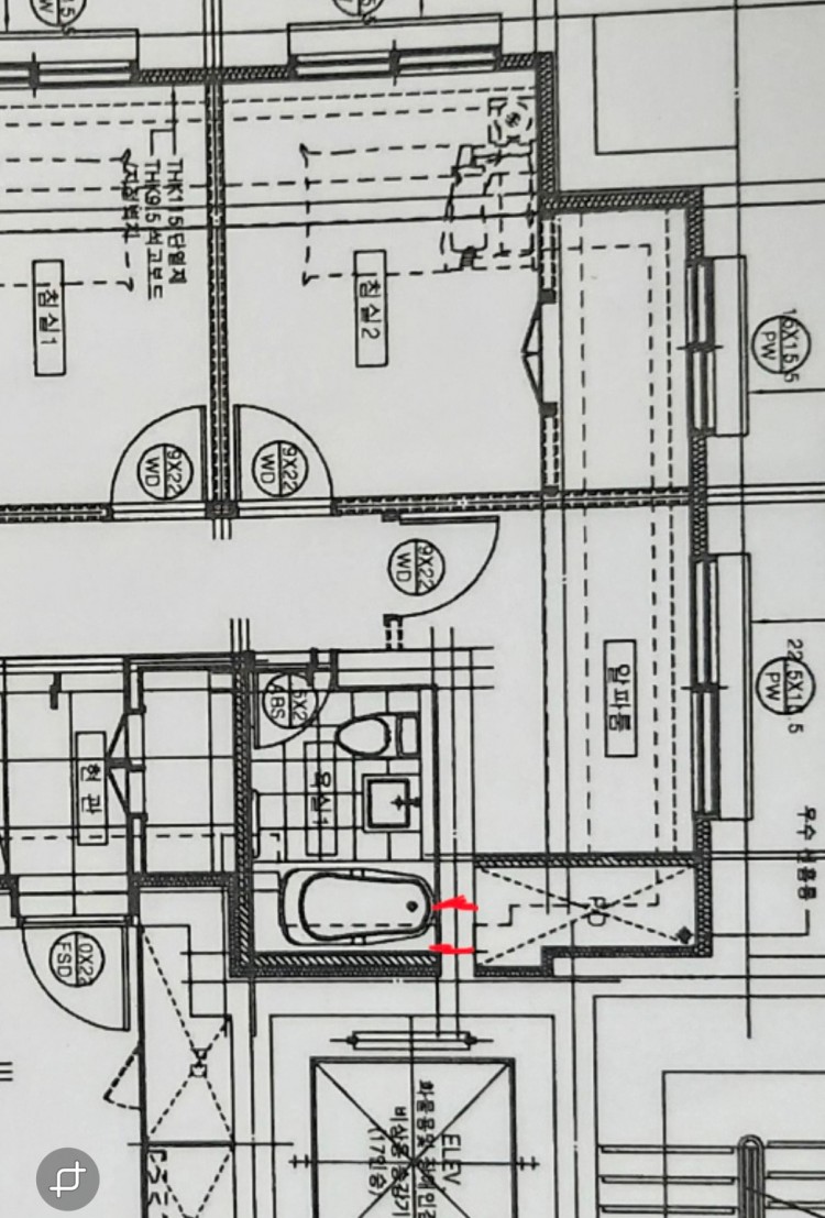 * 화장실 옆이 PD라고 되어 있는 공간이며, 도면상 두 배관(빨간색 표시)은 PD 공간쪽으로 향해 있습니다.