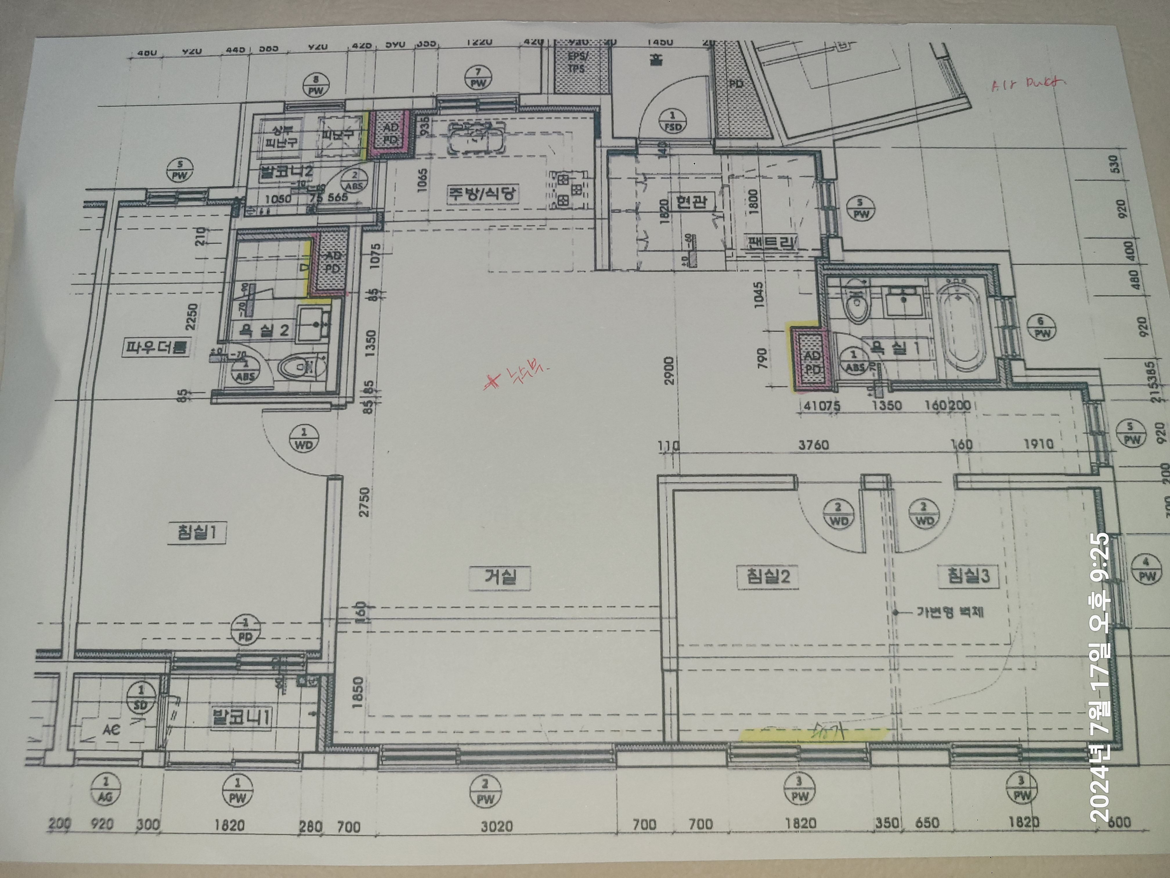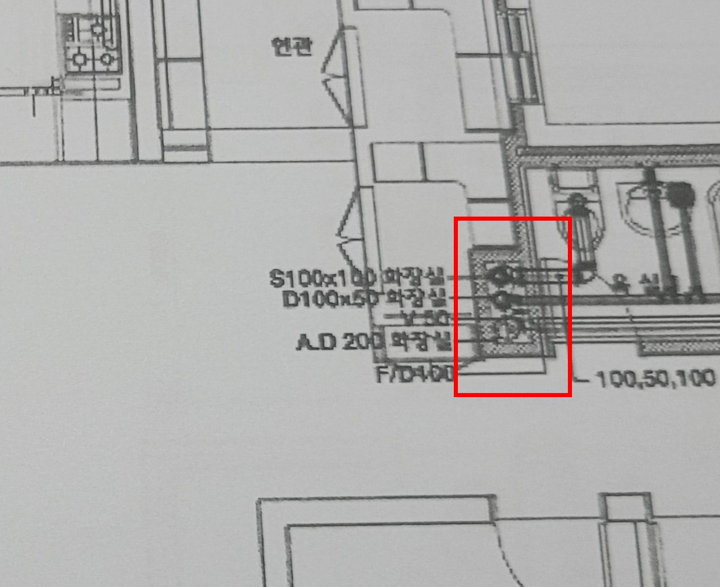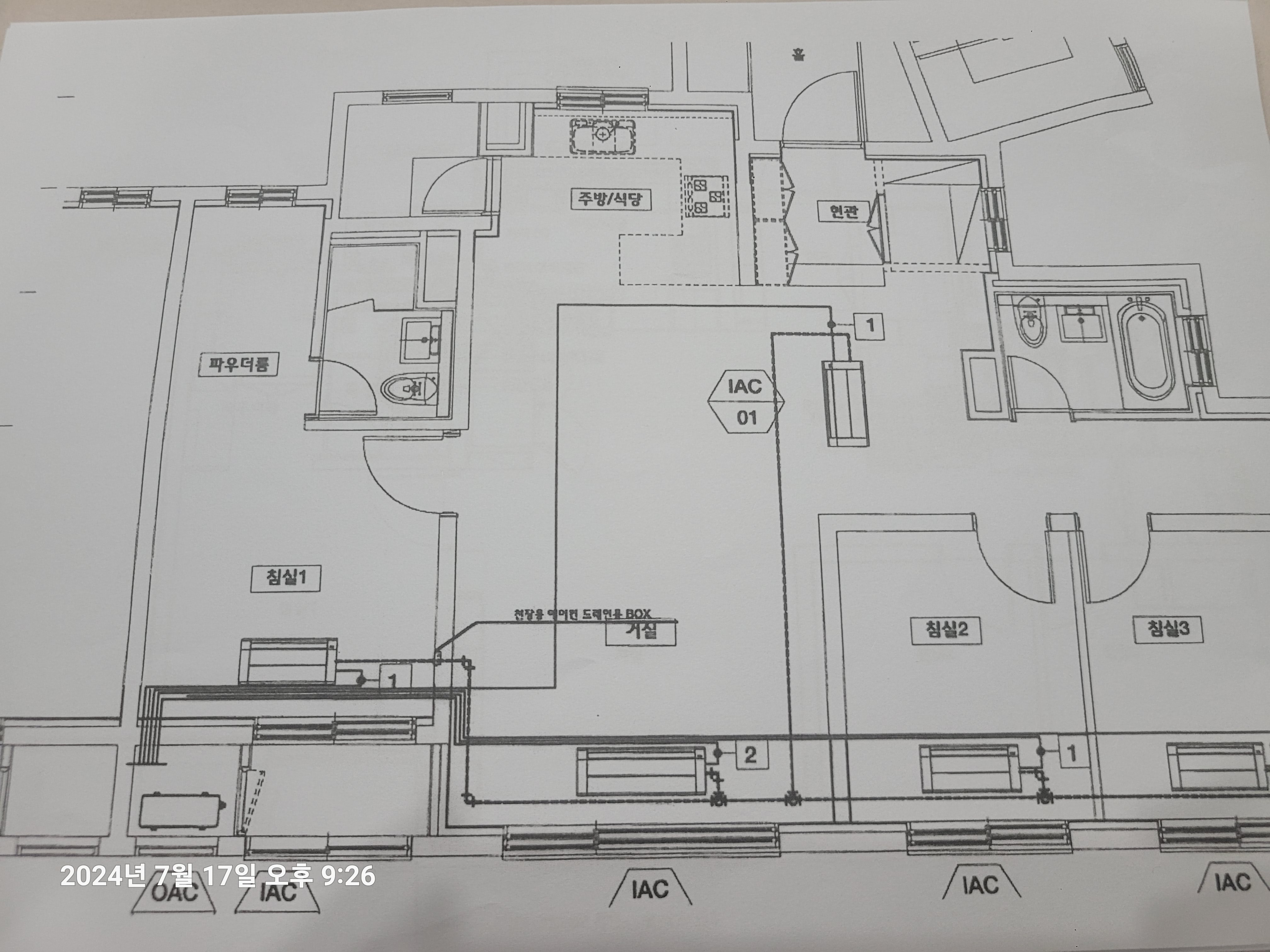 에어컨의 수직 배수는 침실1 쪽으로 되어 있어서 에어컨을 가능성은 낮습니다.