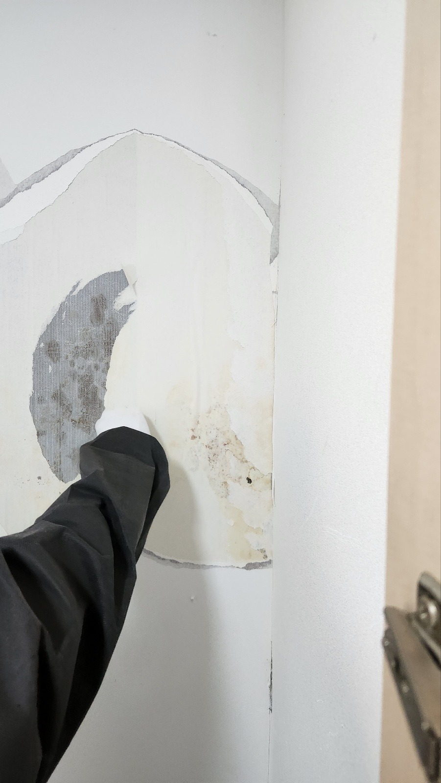 혹시나 싶어서 벽지를 다 뜯어 봤더니 이렇게... 아래쪽 몰딩도 뜯어야되겠다 싶을정도로 벽지 뒤로 곰팡이가 생각보다 많이 숨겨져 있었더라구요...