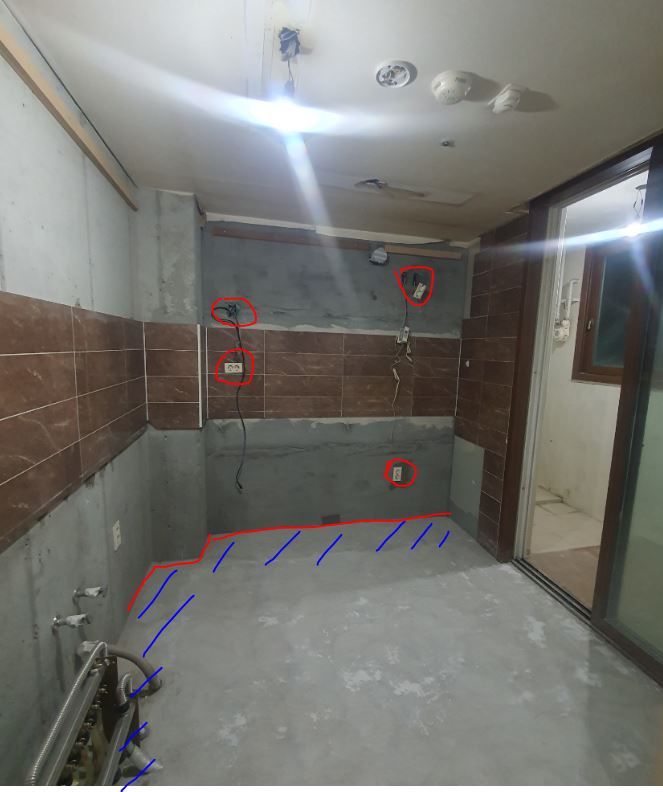 그저 그 미장과 콘크리트 벽이 만나는 틈새, 그리고 그 미장된 벽을 관통하는 배관 주변의 틈새만 보시면 되세요.