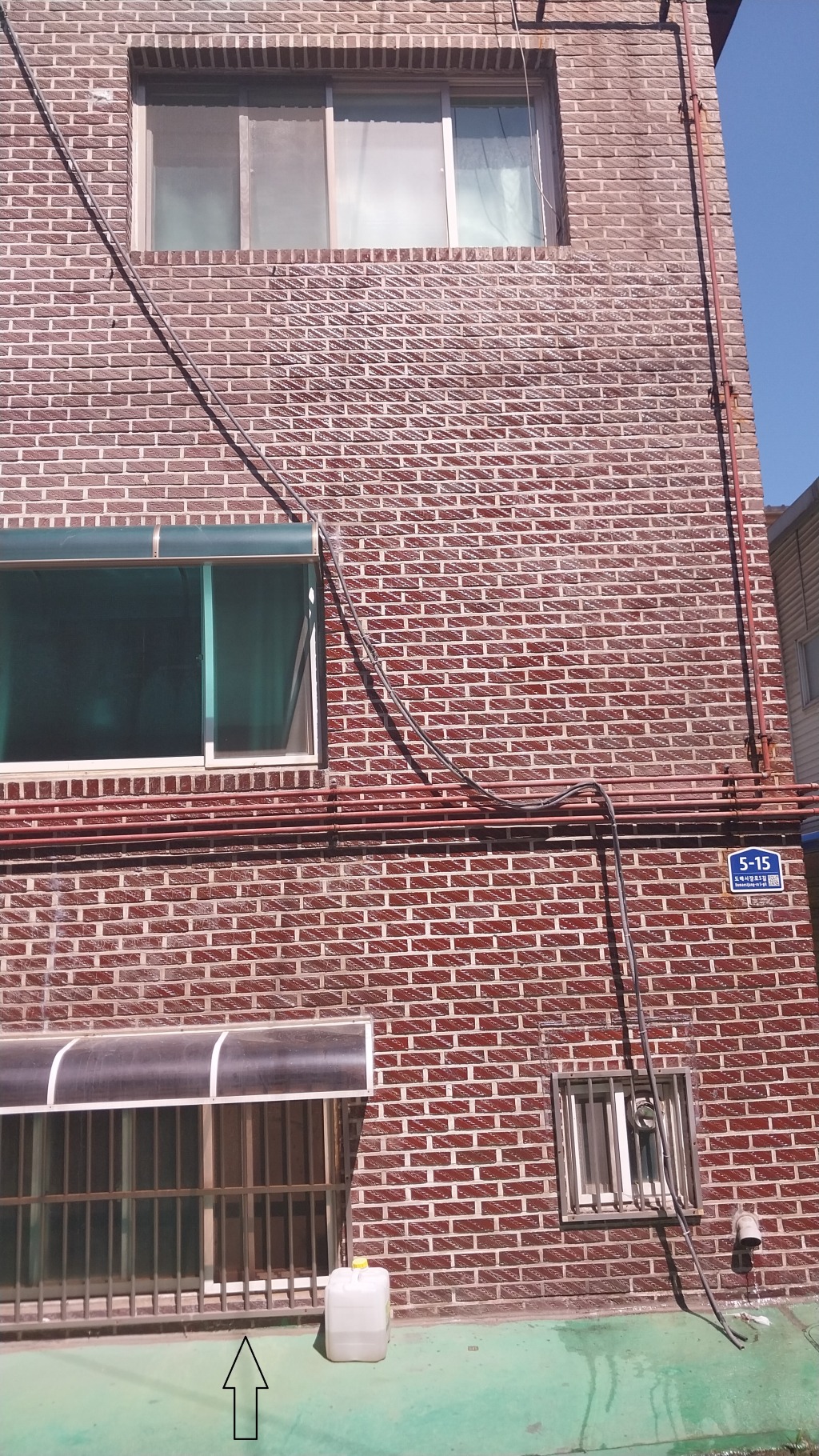 맨 아래에 검은색 화살표 있는 집입니다. 벽이 일부만 반짝거리는 건 방수제를 바른 곳이라 그렇습니다. 맨 처음 왔던 업체가 바로 위의 1층 창틀에서 빗물이 새는 것을 발견하긴 했는데 발수제만 뿌려놓고 그냥 갔습니다. 그 뒤에 온 업체가 1층 창틀이랑 2층 창틀에 실리콘을 발랐는데, 막은 듯 싶다가 다시 들어와서 도배비만 날렸습니다. 그래서 저희가 방수제를 바른 다음 1층 창문 턱에 아예 실리콘을 넓게 펴 발라버렸는데도 누수지점이 하나가 아닌 듯 합니다. 이후 기존 우수관을 막아버리고 외부로 새로 뚫었는데 여전히 들어옵니다.