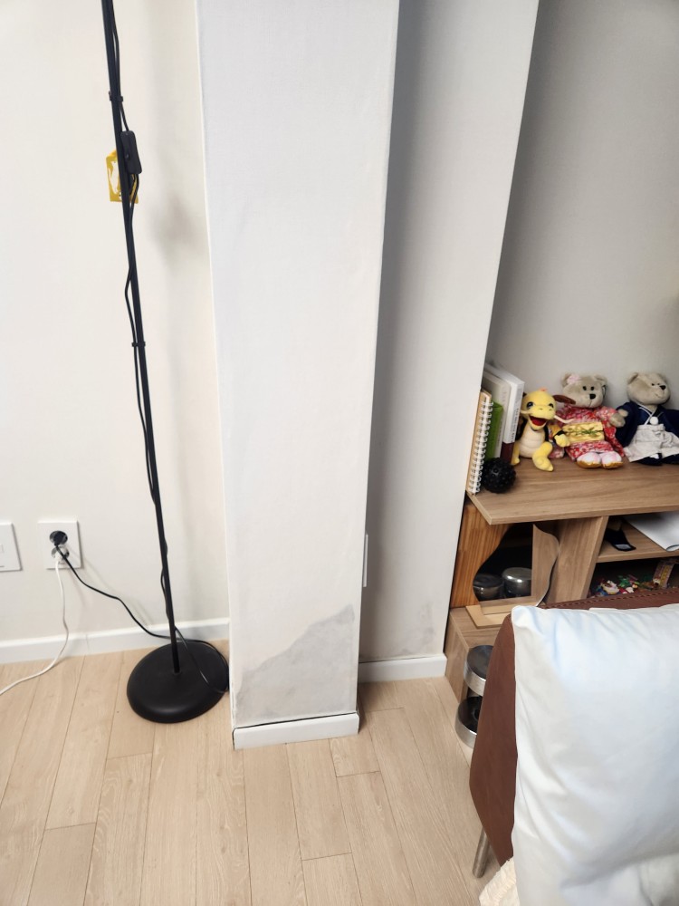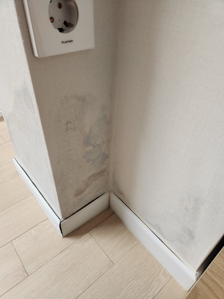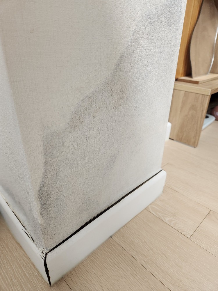 거실을 확장했는데, 가벽아래부분 걸레받이가 벌어지고 벽지 색이 변하고 있습니다.