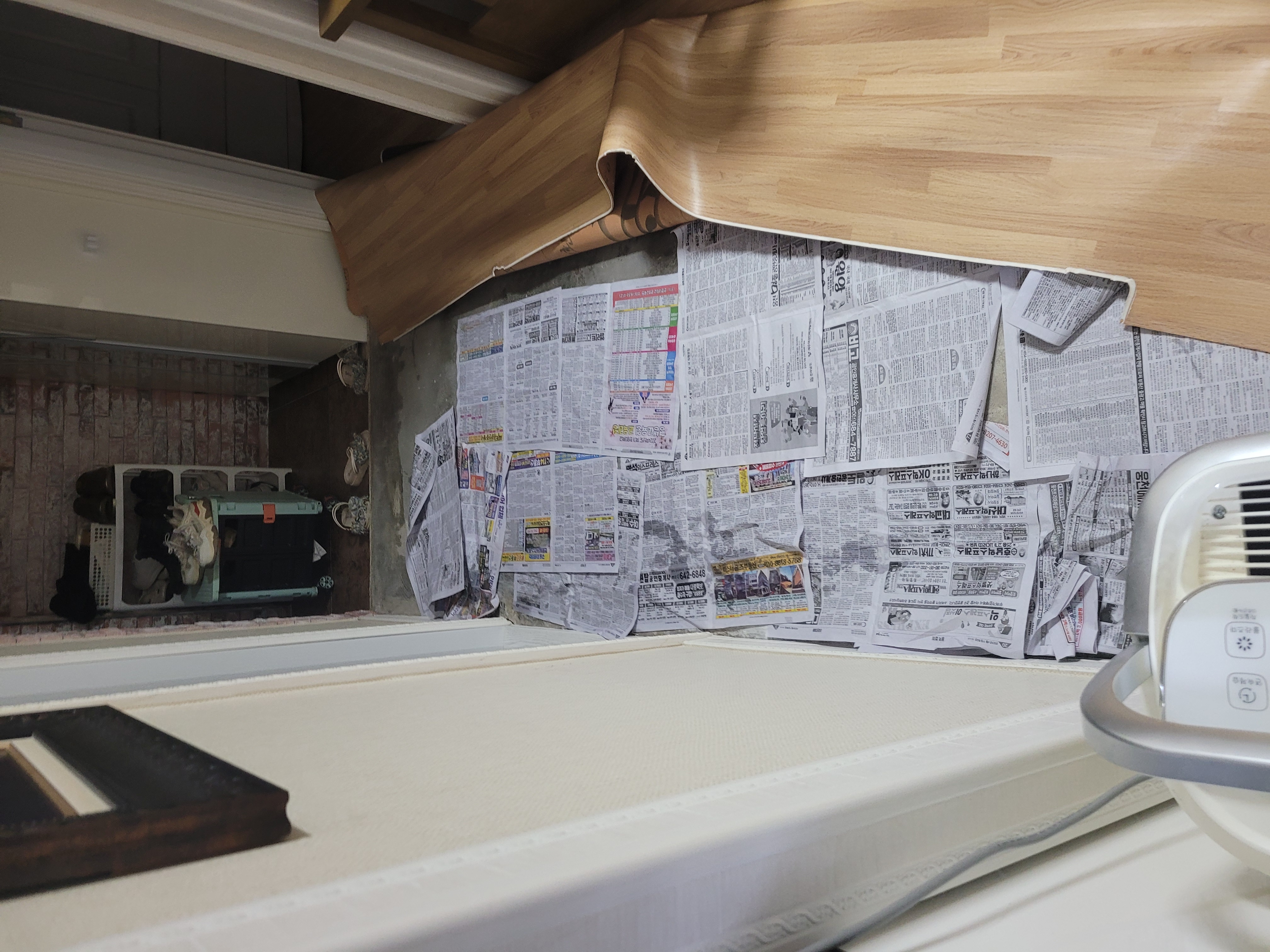 보름전 싱크대밑 벽바닥에서 물이 흥건하게 누수되어 누수업체의뢰했더니 반대편 세면대 온수배관에서 누수가 되어 공사하였습니다. (물은 싱크대밑에서 누수, 아랫집 피해 없으 나, 누수업체에서는 오래된것이라고 합니다.) 습기말려야되는지 모르고 장판덮고 냅두고있다가 벽지에 곰팡 이가 펴 확인해보니 장판바닥이 현관 안방 거실 작은방 모두 습 기가 가득했습니다. 일단 일부 장판만 제거하여 난방과 제습기 돌리고있는데요.