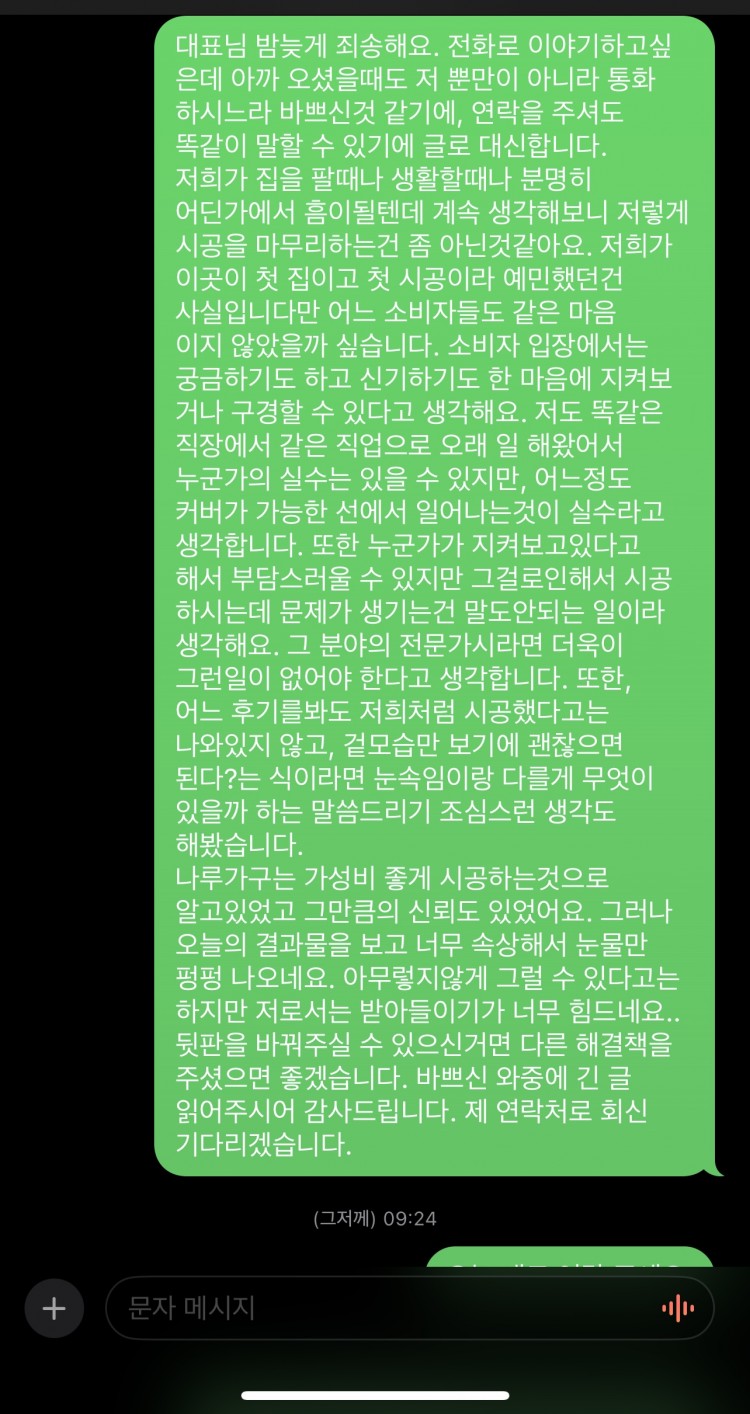 견적보았던 금액인 240만원에 대하여 제값에 못줄 것 같다 요청드려 금액 절감을 요구드려 15만원을 할인받은 225만원으로 시공비를 전액 현금으로 그 자리에서 드려 거래는 완료된 상태이나 저는 눈가림식의 시공으로 마무리가 되었다는것에 큰 실망을 하고있습니다.