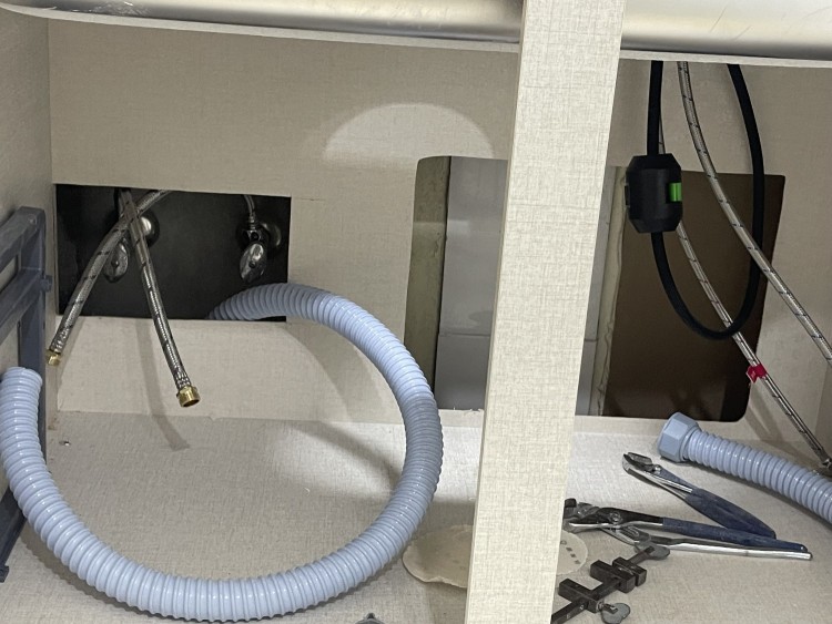 이후 잘못 선정된 위치를 기준으로 모든것이 설치되었다보니 배치가 잘 맞지 않게되었으며, 싱크의 위치가 바뀜으로 인해서 여러 장에 못질과 구멍이 생기게 되었습니다. 이에 이 엄청 큰 구멍을 막기위해 얇은 판자로 덧대놓은 상태입니다.
