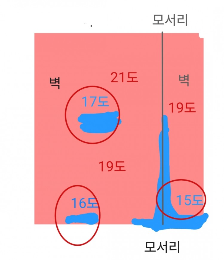 벽 모서리부분 상/ 하단이 모두 낮은 온도로 표시 되는 경우도 있고(초점온도: 벽체21도/모서리 상하단18~19도),