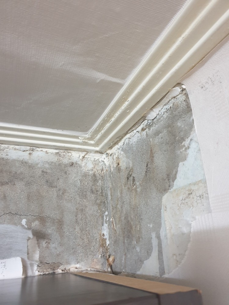 - 벽지를 뜯어보니 실리콘으로 틈을 매운 흔적이 보임.
