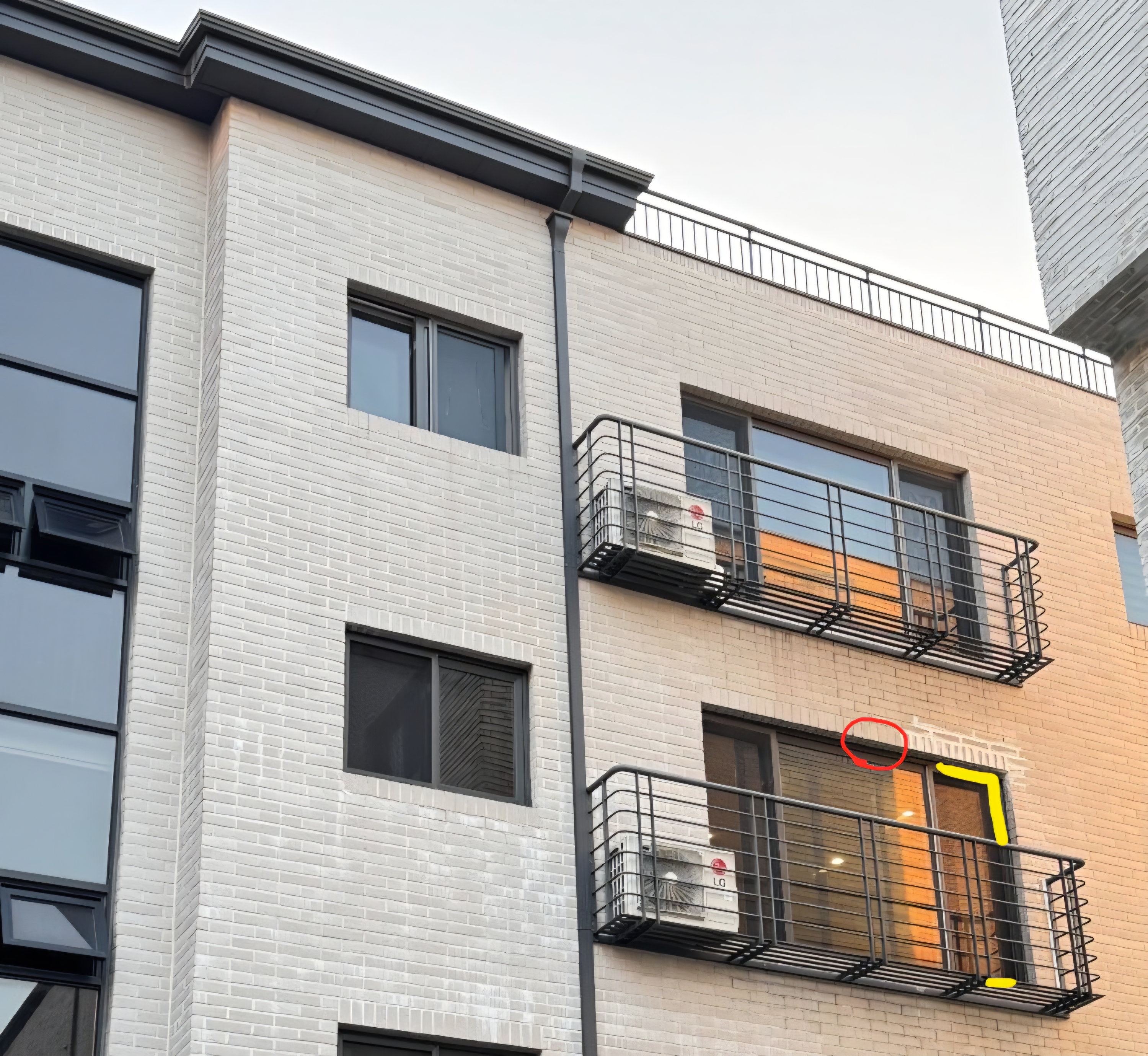•2번 사진: 외부에서 찍은 누수 창틀 (동그라미 표시된 누수 지점)