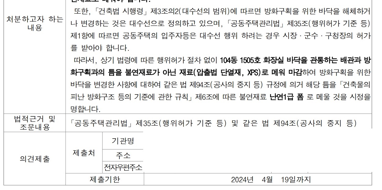 나. 귀하의 민원에 따라 관련 자료를 제출받아 확인한 결과, 104동 1505호 화장실 누수공사를 진행하며 바닥을 관통하는 배관과 방화구획과의 틈을 불연재료가 아닌 재료로 메워 마감한 사실이 확인되어, 관계법령에 따라 행정조치 예정임을 알려드립니다.