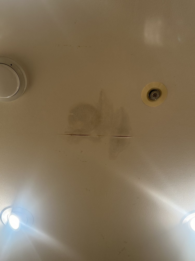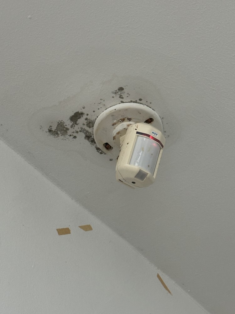 그런데 안방 드레스룸쪽 천장에 사진과 같이 물자국과 곰팡이 자 국을 확인했는데요.