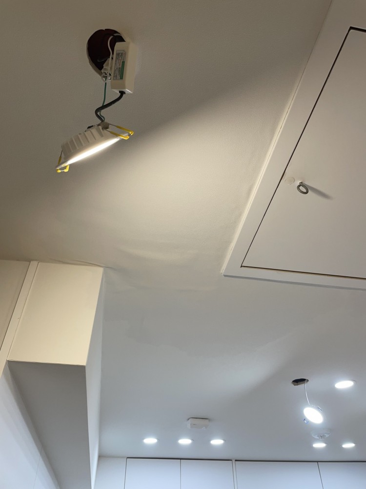 천장의 여러군데 다운라이트를 제거하고 안을 찍어보았는데 천장석고면은 온전한 상태였고 다만 천장안쪽에서 찍은 영상중 계단실쪽 목제가 젖은것이 발견되었습니다.
