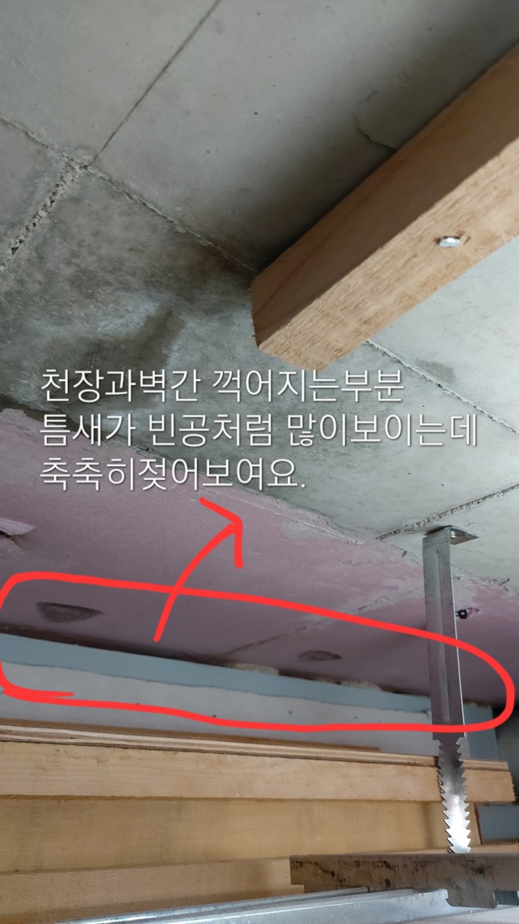 천장과 벽간 이어지는 라인에 폭 틈새가 많이보이고 그틈새 라인위의 단열재 색도진한게 젖어보이는데 다른집들도 보통 저런상태일까요?
