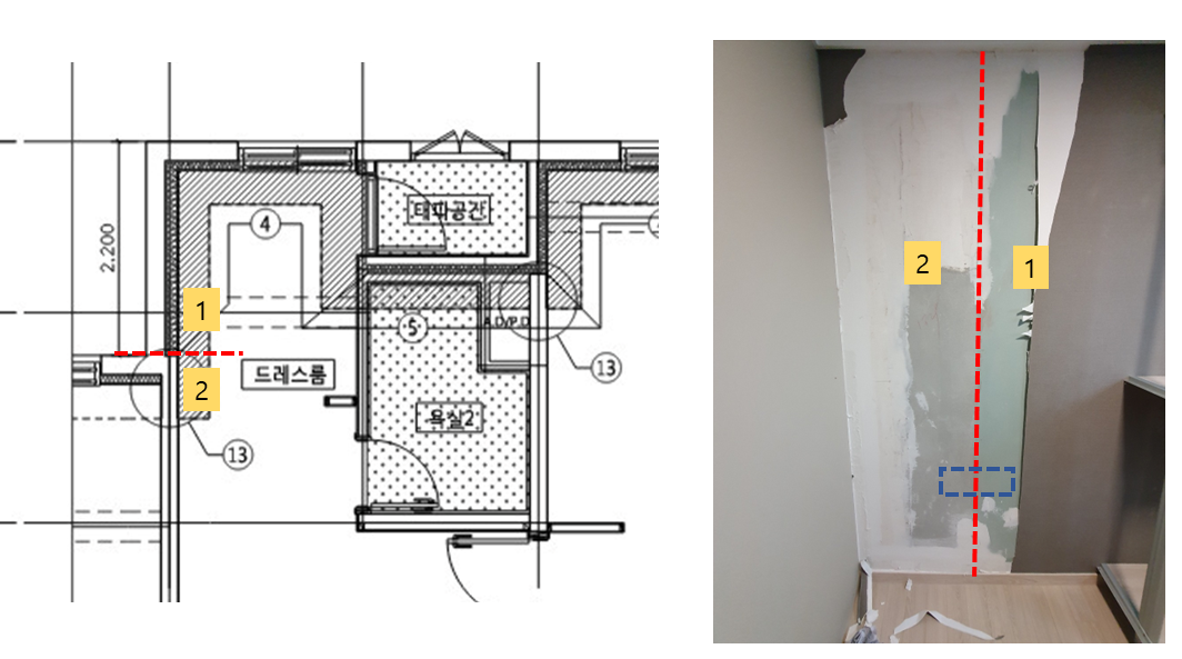 Q2-1. 벽지를 절개했을 때, 저희가 어떤 부분을 어떻게 확인해야 하나요? (도면과 동일한지 여부 확