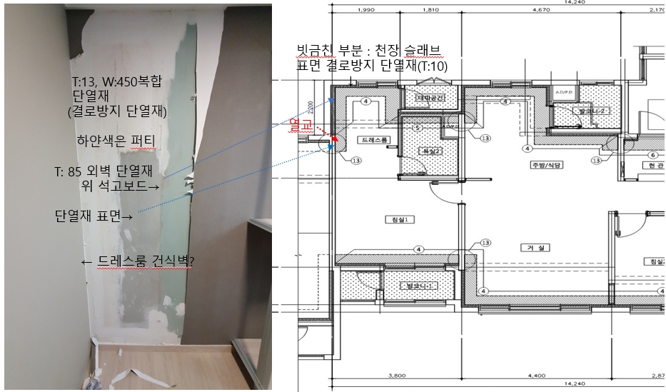 as센터에서는 드레스룸이 북쪽에 위치해있고, 바람이 불어 옆 세대와 연결한 조인트 부분(도면의 13번 부분)에 결로가 생긴 것이다. 습도 조절을 위해 제습기를 24시간 가동하라고 답변하고, 아무 조치를 하지 않았습니다.