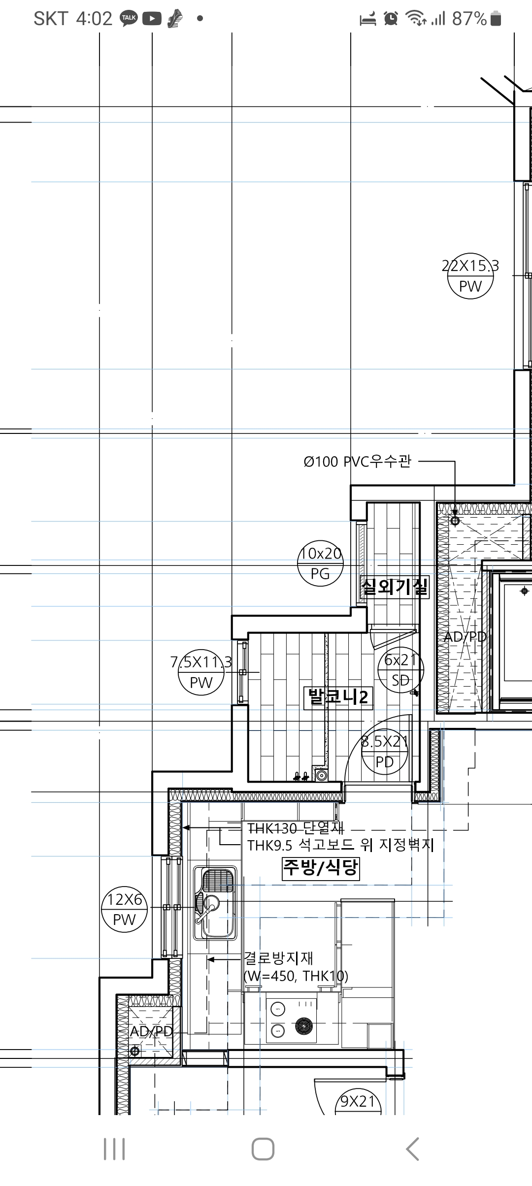 그러고 보니 설계도에도 플라스틱 문(PD)으로 표기되어 있네요. 단열라인을 지나는 문을 밀폐성능이 없는 문으로 설계했다니 매우 의아합니다. 건축쪽 전문가가 아니라 설계를 평가할 수 있는 입장은 아닙니다만, 상식적인 수준에서 생각해보면 이 문의 닫힌 틈으로 습기가 빠져나간다면 발코니 벽에 결로가 발생할 수 밖에 없습니다.