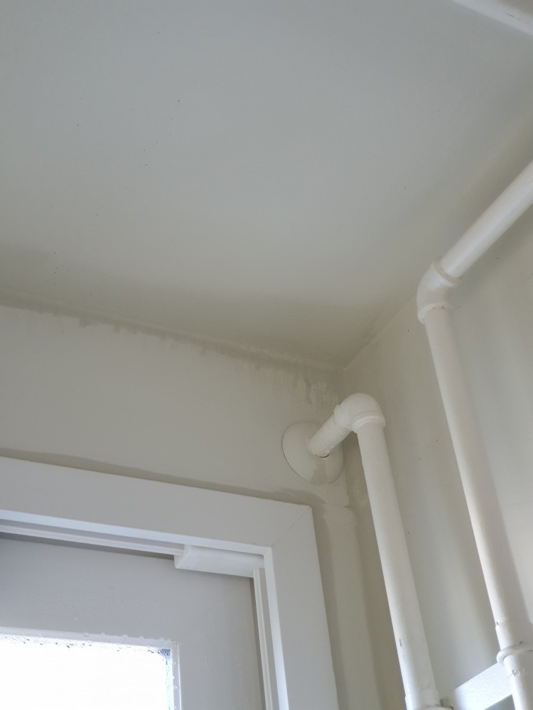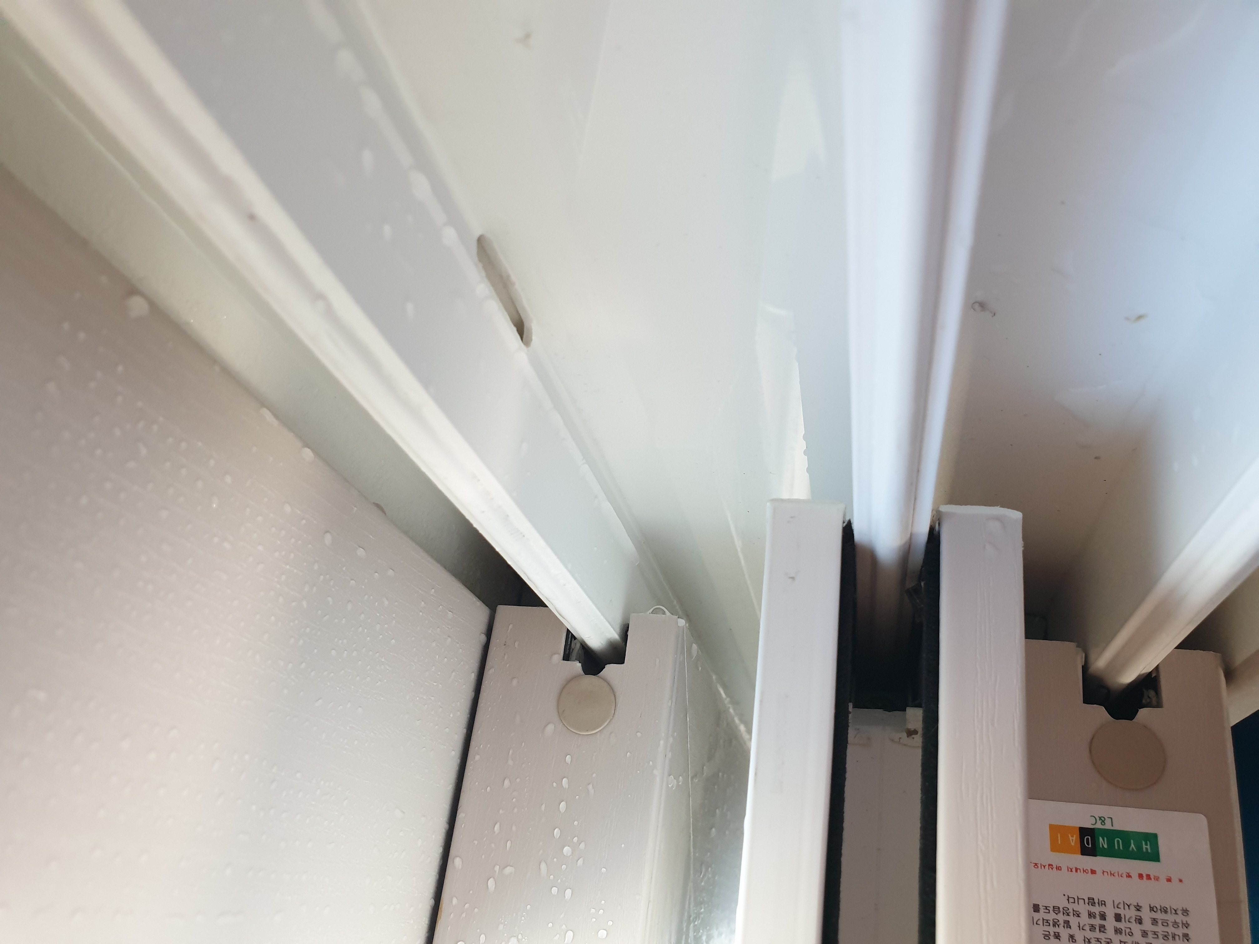 사진에 베란다 샷시(플라스틱부분)는 물맺힘 없이 유리에서 흐르고 틀과외벽이 만나는 부분  실리콘 부분에 결로가생겨 흐릅니다...