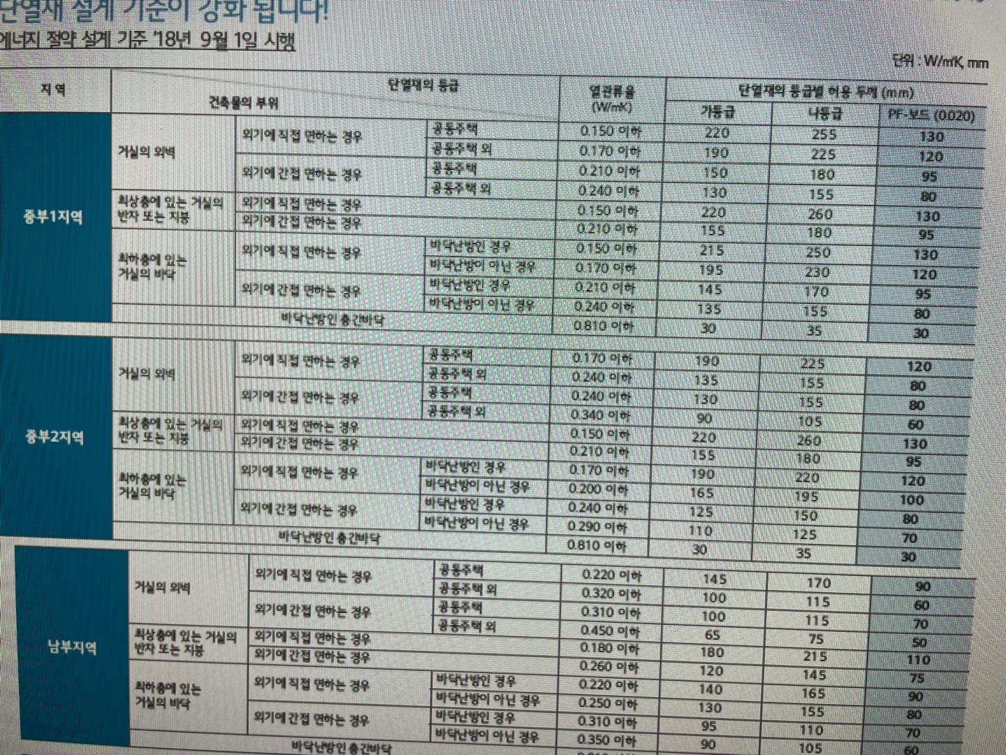 저도 궁금한내용입니다. 저희아파트가 복층 탑층인데 아랫층 방 윗면이 위층 야외테라스인곳도 있고 위층 방인경우도 있고 그렇데. 2층 방들은 다 건물 옥상이어서 최상층 지붕으로 볼꺼 같은데 아래층 은 최상층에 해당되는지(위층이 테라스인경우) 궁금하네요. 제가 찾아본 표를 첨부해보겠습니다. 저희 도면에는 pf보드로 시공되어있다고 되어있어서. 외기면에 직접접하는경우 12센치인데 최상층은 13센치로 되어있습니다.